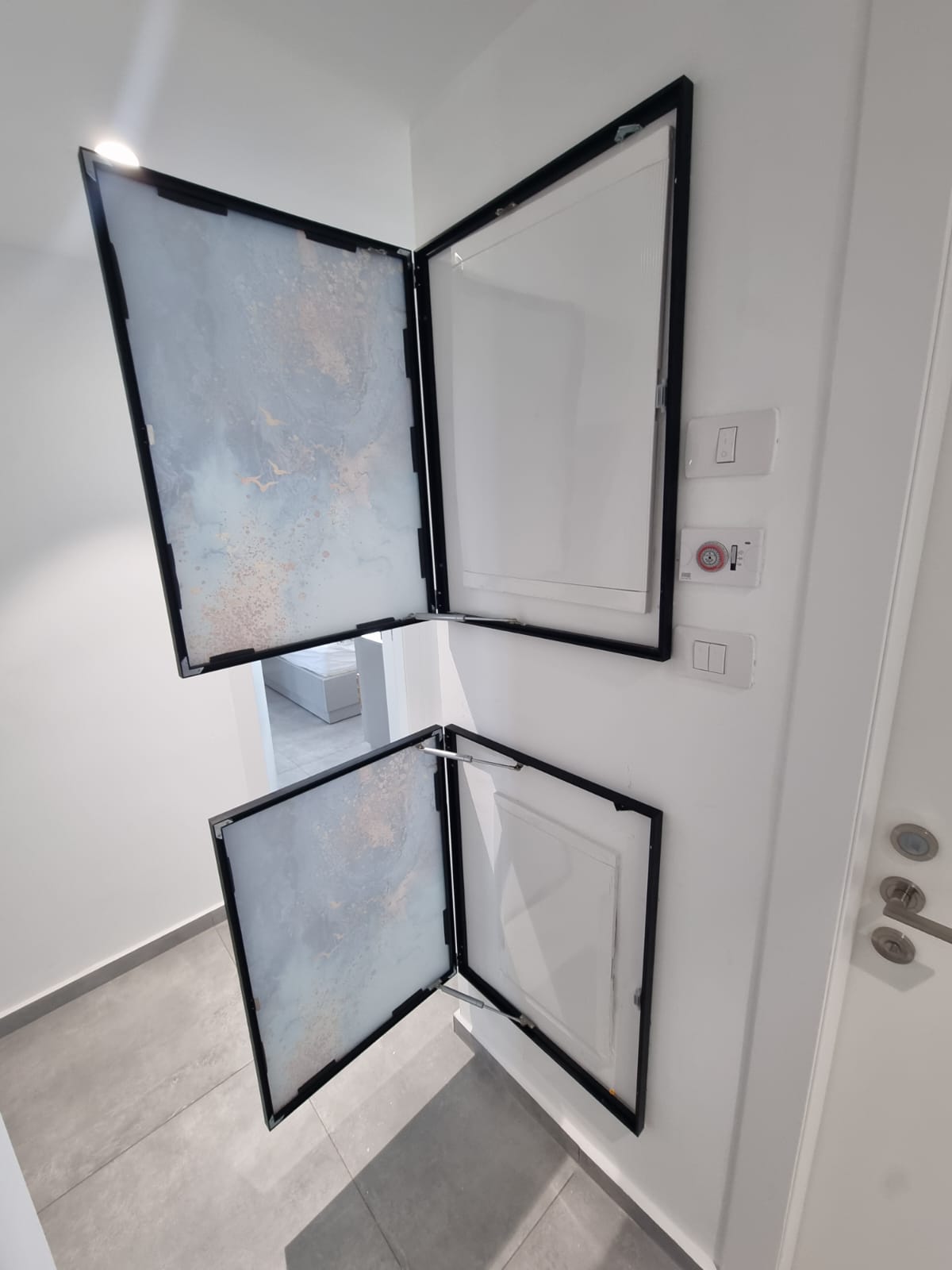 כשמדובר בסביבה משפחתית, כיסוי לארון חשמל ביתי חייב לעמוד בתקני בטיחות מחמירים. אצלנו בפרינט גלאס, כל כיסוי לארון חשמל ביתי מיוצר מזכוכית מחוסמת, שהיא חזקה פי כמה מזכוכית רגילה ובמקרה של מכה חזקה היא מתנפצת לרסיסים קטנים שאינם מסוכנים. בנוסף, הנדסת המוצר של כיסוי לארון חשמל ביתי במידות הקבועות שלנו (45/65 או 55/75) כוללת מסגרת אלומיניום כפולה עם צירים ובוכנות איכותיות. מערכת זו מאפשרת פתיחה קלה וחלקה לצד (ימין או שמאל לבחירתכם), כך שבעת הצורך בגישה ללוח החשמל, הפעולה מתבצעת ללא מאמץ ובבטיחות מקסימלית.