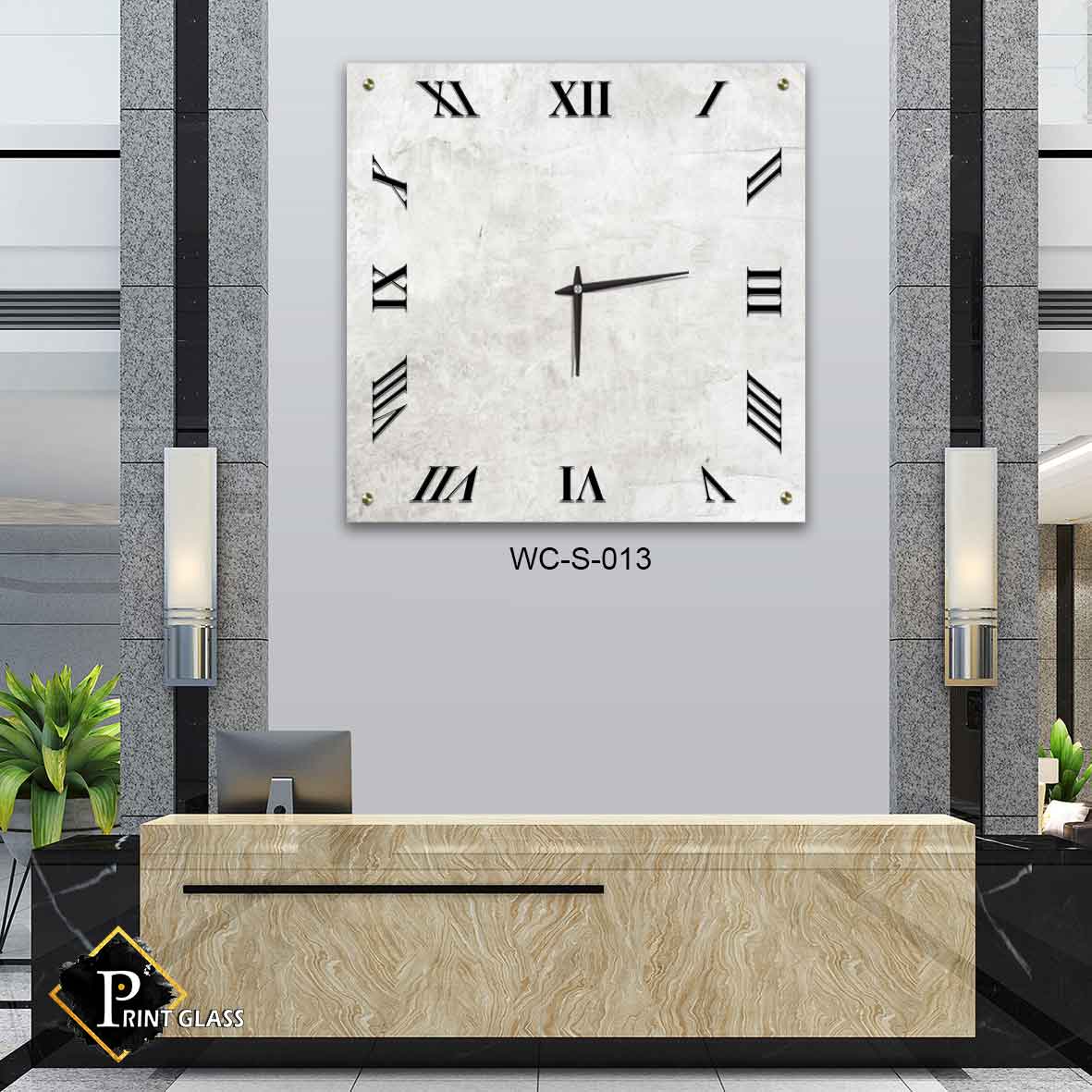 שעון קיר לפינת אוכל מזכוכית ברקע אפור אבן. מדגם – WC-S-013. שעון זכוכית מרובע לקיר בפינת האוכל ברקע שיש אפור. מגיע עם מחוגים שקטים גדולים ואיכותיים. מתאים לעיצוב הסלון או המשרד. מתאים גם לעיצוב העסק בצורה יוקרתית וייחודית , זכוכית מחוסמת 6מ"מ הדפסה על זכוכית בטכנולוגיה UV חדשנית.