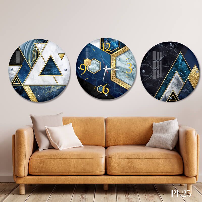 שעון קיר מיוחד לסלון מזכוכית אבסטרקט כחול. דגם PL-25. שעון זכוכית עגול לסלון ב3 חלקים ברקע כחול עמוק ומספרים מזהב. מגיע עם מחוגים שקטים גדולים ואיכותיים. שעון אבסטרקט סגול זהב לעיצוב הבית והסלון או עיצוב לובי בניין. מתאים גם לעיצוב העסק בצורה יוקרתית וייחודית , זכוכית מחוסמת 6מ"מ הדפסה על זכוכית בטכנולוגיה UV חדשנית.