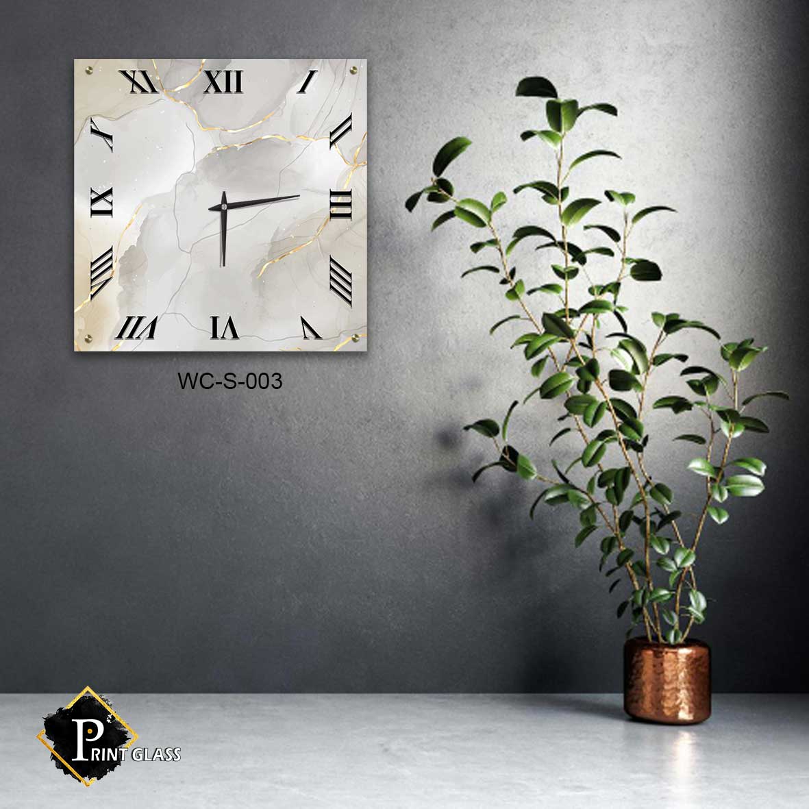 שעון קיר דקורטיבי לסלון מזכוכית ברקע שיש אפור זהב. מדגם – WC-S-003. שעון זכוכית מרובע לקיר בסלון ברקע שיש אפור זהב. מגיע עם מחוגים שקטים גדולים ואיכותיים. מתאים לעיצוב הסלון או המשרד. מתאים גם לעיצוב העסק בצורה יוקרתית וייחודית , זכוכית מחוסמת 6מ"מ הדפסה על זכוכית בטכנולוגיה UV חדשנית.