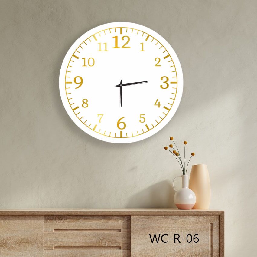 שעון קיר מיוחד לסלון מזכוכית עם רקע לבן זהב. מדגם – WC-R-06. שעון זכוכית עגול לקיר בסלון ברקע לבן חלק ומספרים בצבע זהב. מגיע עם מחוגים שקטים גדולים ואיכותיים. מתאים לעיצוב הסלון או המשרד. מתאים גם לעיצוב העסק בצורה יוקרתית וייחודית , זכוכית מחוסמת 6מ"מ הדפסה על זכוכית בטכנולוגיה UV חדשנית.