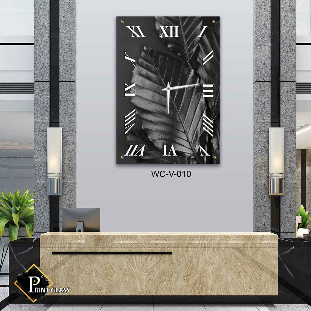 שעון קיר לסלון מזכוכית ברקע של עלה שחור. מדגם – WC-V-010. שעון זכוכית מלבני לקיר בסלון ברקע עלה שחור. מגיע עם מחוגים שקטים גדולים ואיכותיים. מתאים לעיצוב הסלון או המשרד. מתאים גם לעיצוב העסק בצורה יוקרתית וייחודית , זכוכית מחוסמת 6מ"מ הדפסה על זכוכית בטכנולוגיה UV חדשנית.