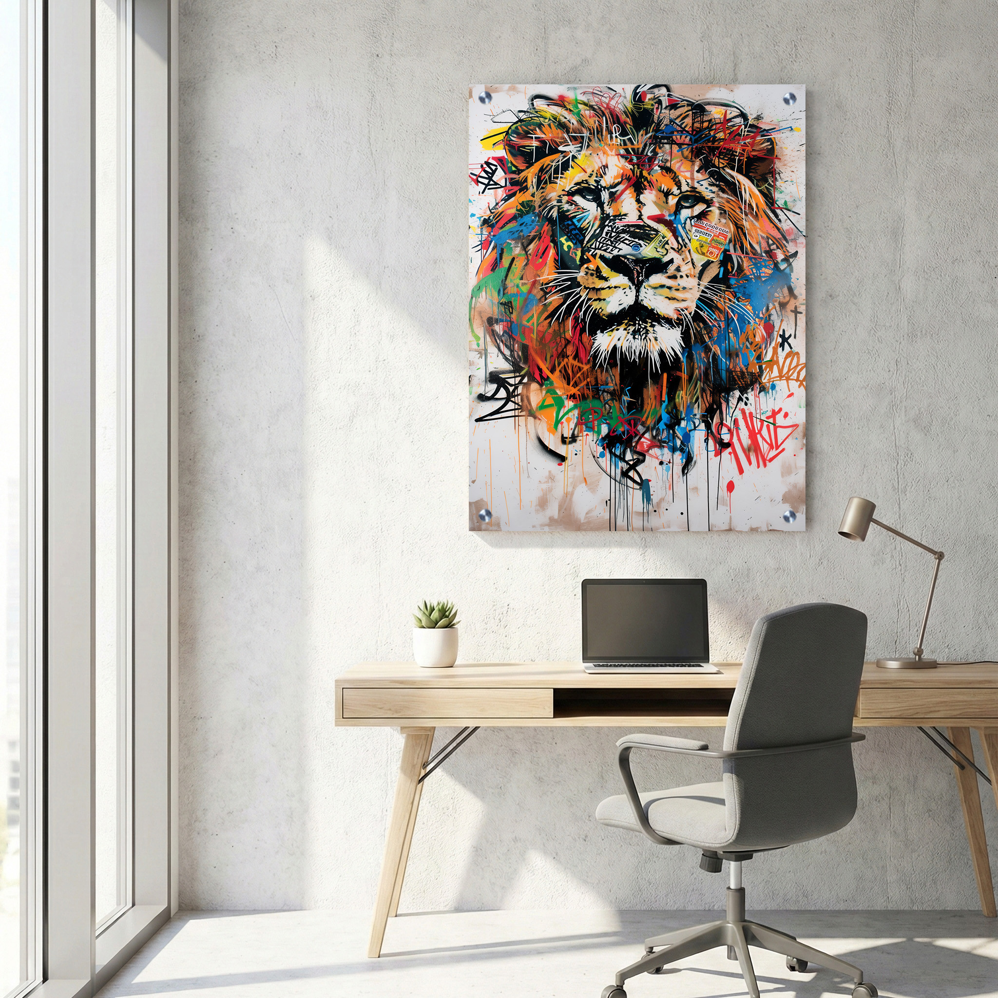תמונת זכוכית מרהיבה המציגה ראש אריה בסגנון גרפיטי צבעוני, עם ניזולת צבע החודרת למרחב הלבן מסביב. הדפסה על זכוכית זו משדרגת כל משרד באמצעות קומפוזיציה לאורך מלבנית המדגישה את העוצמה והדינמיות של היצירה. תמונת זכוכית זו מבטאת עיצוב מודרני וחדשני, המתאים במיוחד לתמונות זכוכית למשרד בעיצוב אמנותי ייחודי. התמונה על זכוכית מאפשרת שילוב רענן ומרשים עם גווני הצבע העזים והניזולת, המשלבים יופי ואווירה חיה עם נוכחות פורצת דרך.