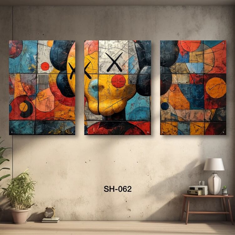 תמונות זכוכית – SH-062. שלוש תמונות על זכוכית של בובה צבעוניות בסגנון פופ ארט. מתאים גם לעיצוב הבית בצורה יוקרתית וייחודית. זכוכית מחוסמת 6מ"מ הדפסה על זכוכית בטכנולוגיה UV חדשנית.