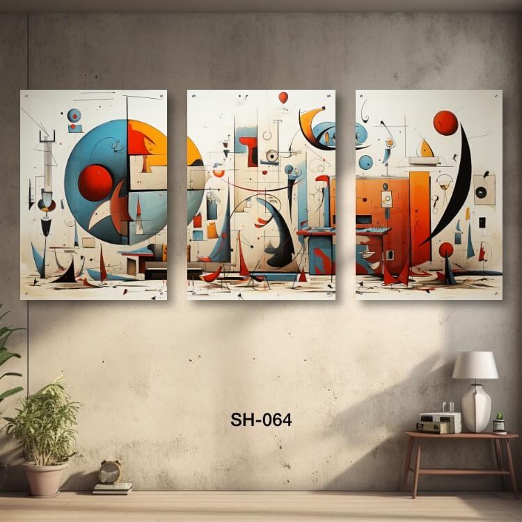 תמונות זכוכית לסלון – SH-064. שלוש תמונות על זכוכית של כל מיני צורות גאומטריות על רקע לבן. מתאים גם לעיצוב הבית בצורה יוקרתית וייחודית. זכוכית מחוסמת 6מ"מ הדפסה על זכוכית בטכנולוגיה UV חדשנית.