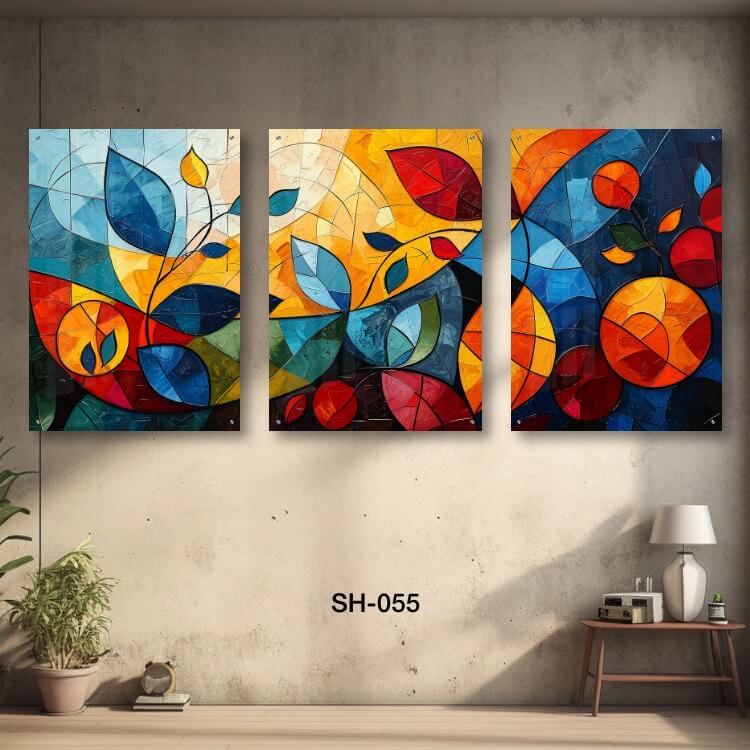 תמונות זכוכית לסלון – SH-055. שלוש תמונות על זכוכית של עלים בסגנון צורני ובצבעים צבעוניים. מתאים גם לעיצוב הבית בצורה יוקרתית וייחודית. זכוכית מחוסמת 6מ"מ הדפסה על זכוכית בטכנולוגיה UV חדשנית.