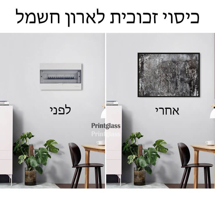 כיסוי ארון חשמל ותקשורת לבית מגיע עם מסגרת אלומיניום חזקה ושני בוכנות אשר מחזיקות את המסגרת. תמונות הזכוכית מודפסות בהדפסה ישירה על זכוכית בטכנולוגיה uv חדשנית המעניקה תחושה של תלת מיימד.