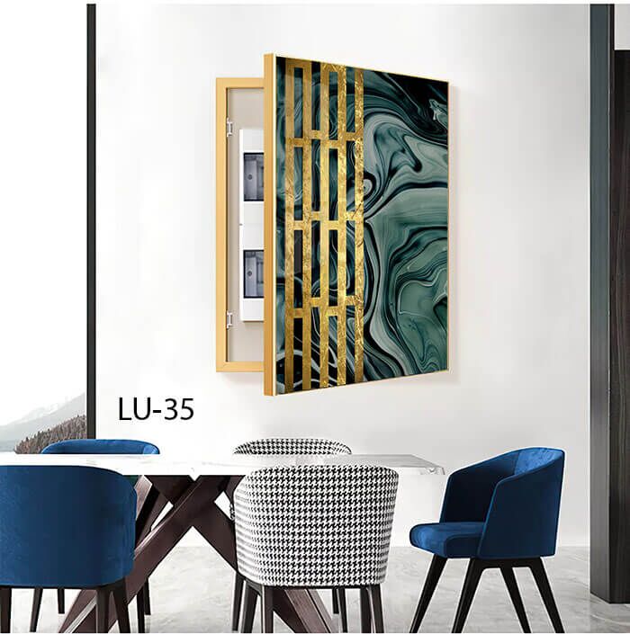כיסוי ארון חשמל ותקשורת עם תמונה מזכוכית של עשן שחור ירוק ומסגרת זהב. דגם LU-35. לעיצוב כיסוי ארון חשמל הבייתי שלכם. מגיע עם מסגרת אלומיניום חזקה בשני צבעים לבחירה, שחור וזהב. שני בוכנות אשר מחזיקות את המסגרת. הכיסוי מודפס על זכוכית מחוסמת 6מ"מ. הדפסת תמונות על זכוכית בטכנולוגיה UV חדשנית ובאיכות גובהה.