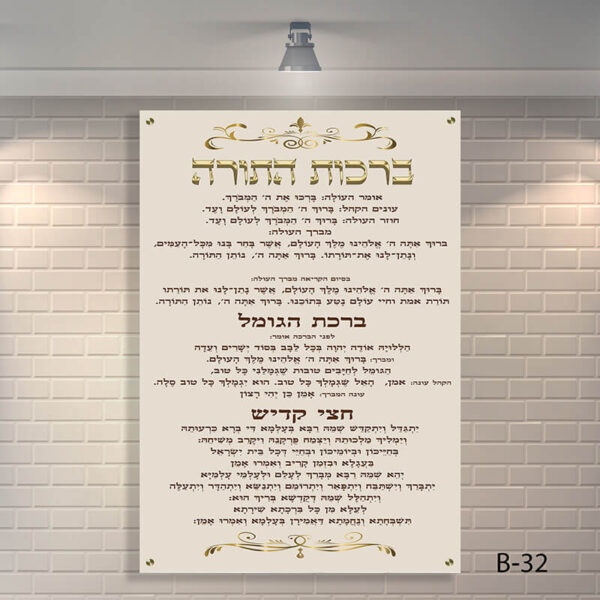 שדרגו את בימת הקריאה בתורה עם שלט לבית כנסת פרקטי ומעוצב, המאגד את כל הברכות הנחוצות לעולה לתורה במקום אחד נגיש וברור. דגם B-32 תוכנן בקפידה כדי לספק מענה מושלם לצרכי הגבאי והמתפללים: הוא כולל את ברכות התורה (לפני ואחרי הקריאה), ברכת הגומל, וחצי קדיש. העיצוב הנקי, המשלב רקע בגוון שמנת רך עם טיפוגרפיה מוזהבת ועיטורים קלאסיים, מבטיח קריאות מקסימלית ומראה מכובד המשתלב בהרמוניה עם ריהוט בית הכנסת .