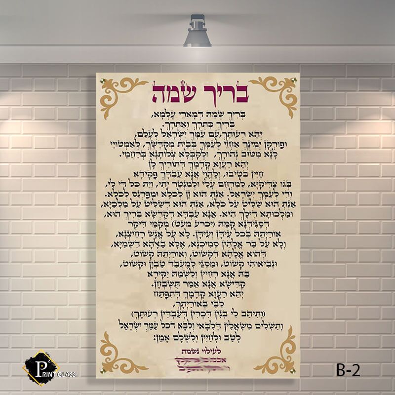 שלטים ותמונות לבית הכנסת מודפס על גבי זכוכית בעובי 6ממ זכוכית מחוסמת ובטיחותית, ניתן להכין מגוון רחב של מידות וסוגי שלטים בהתאמה אישית, לדוגמא ברכת המוציא, שמע ישראל ושלטי חס ורחמים, מזמור לדוד, בריך שמה, ברכות הכהנים, מודים דרבנן, קדיש על ישראל, למנצח, ועוד הרבה ברכות עם תוספת עילוי נשמת הנפטרים והיקרים שלכם אם יש לכם רעיון לפסוק שיודפס על השלט, אתם כמובן יכולים לפנות אלינו ואנו נדאג לתת מענה אנושי וליווי אישי עד לקבלת העיצוב המושלם של בית הכנסת.