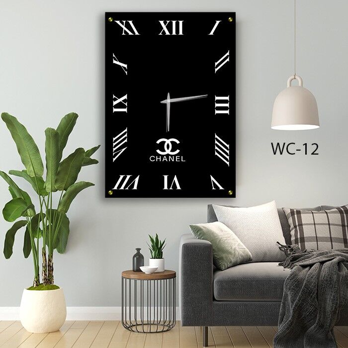 שעון קיר מיוחד לסלון ברקע שחור ולוגו. מדגם – WC-12. שעון זכוכית מלבני מיוחד לקיר בסלון ברקע שחור חלק ומספריים רומיים לבנים ולוגו של קוקו שאנל. מגיע עם מחוגים שקטים גדולים ואיכותיים. מתאים לעיצוב הסלון או המשרד. מתאים גם לעיצוב העסק בצורה יוקרתית וייחודית , זכוכית מחוסמת 6מ"מ הדפסה על זכוכית בטכנולוגיה UV חדשנית.