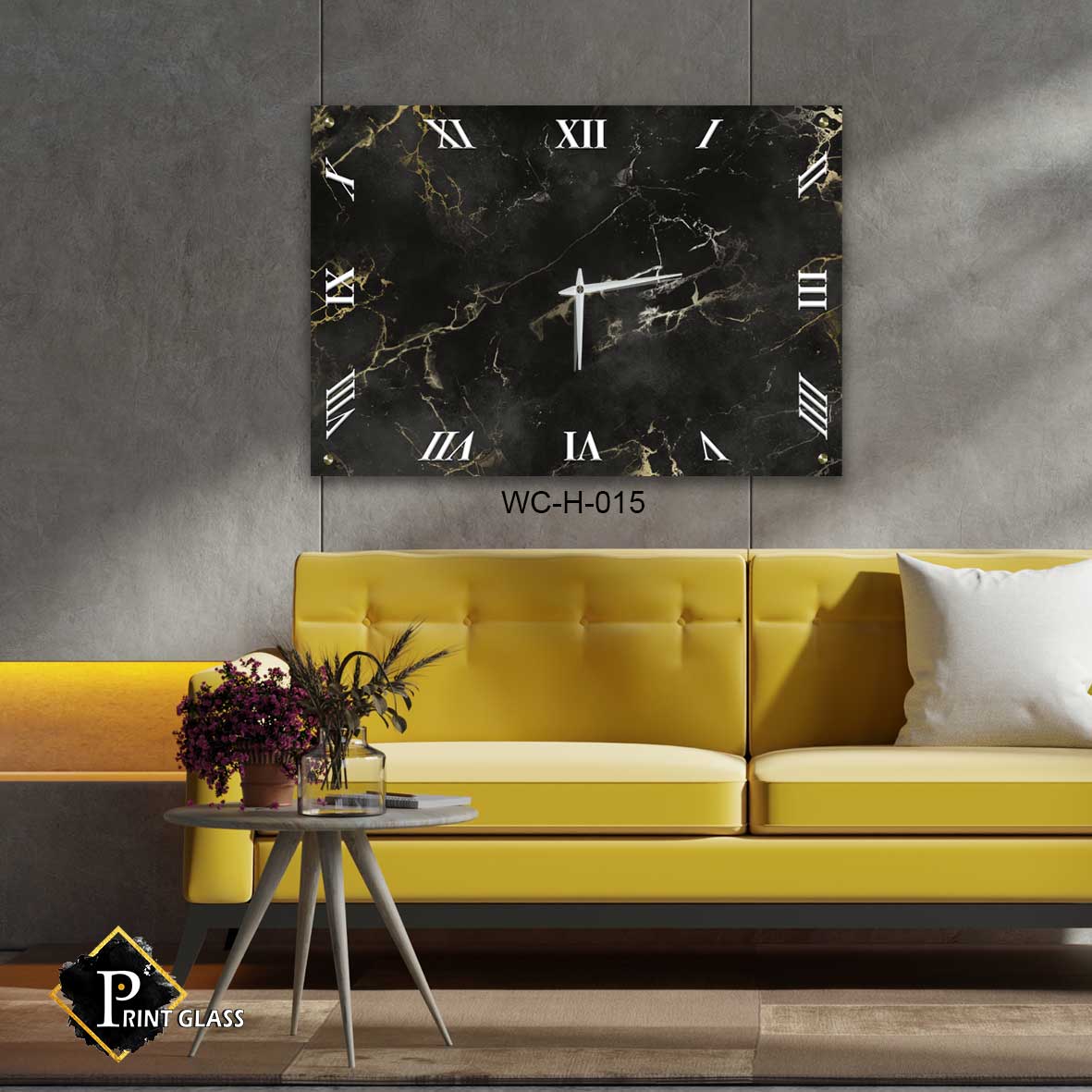 שעון זכוכית שחור לסלון ברקע שיש עם זהב. דגם WC-H-015. שעון קיר מלבני מזכוכית לסלון ברקע שחור שיש וברקים מזהב ומספרים רומיים בצבע לבן. מגיע עם מחוגים שקטים גדולים ואיכותיים. לעיצוב הבית והסלון או עיצוב לובי בניין. מתאים גם לעיצוב העסק בצורה יוקרתית וייחודית , זכוכית מחוסמת 6מ"מ הדפסה על זכוכית בטכנולוגיה UV חדשנית.