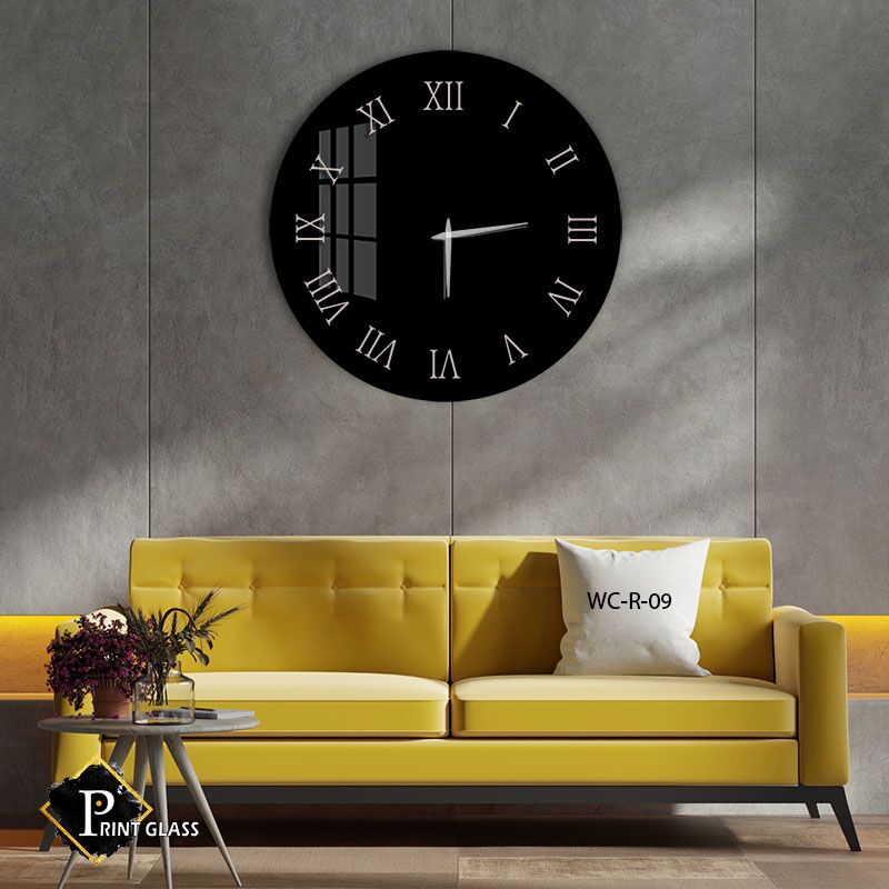 שעון קיר יוקרתי לסלון מזכוכית עם רקע שחור. מדגם – WC-R-09.שעון זכוכית עגול ברקע שחור חלק ומספרים רומיים בצבע כסף. מגיע עם מחוגים שקטים גדולים ואיכותיים. מתאים לעיצוב הסלון או המשרד. מתאים גם לעיצוב העסק בצורה יוקרתית וייחודית , זכוכית מחוסמת 6מ"מ הדפסה על זכוכית בטכנולוגיה UV חדשנית.