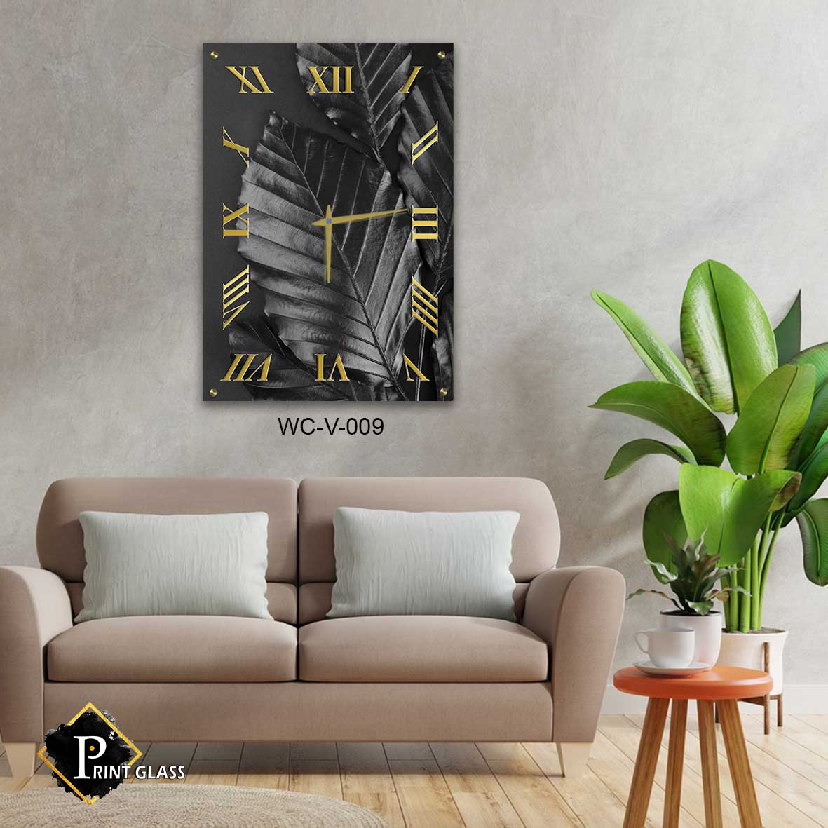 שעון קיר דקורטיבי לסלון מזכוכית של עלים שחורים. מדגם – WC-V-009. שעון זכוכית מלבני לקיר בסלון ברקע עלים שחורים ומספריים רומים. מגיע עם מחוגים שקטים גדולים ואיכותיים. מתאים לעיצוב הסלון או המשרד. מתאים גם לעיצוב העסק בצורה יוקרתית וייחודית , זכוכית מחוסמת 6מ"מ הדפסה על זכוכית בטכנולוגיה UV חדשנית.