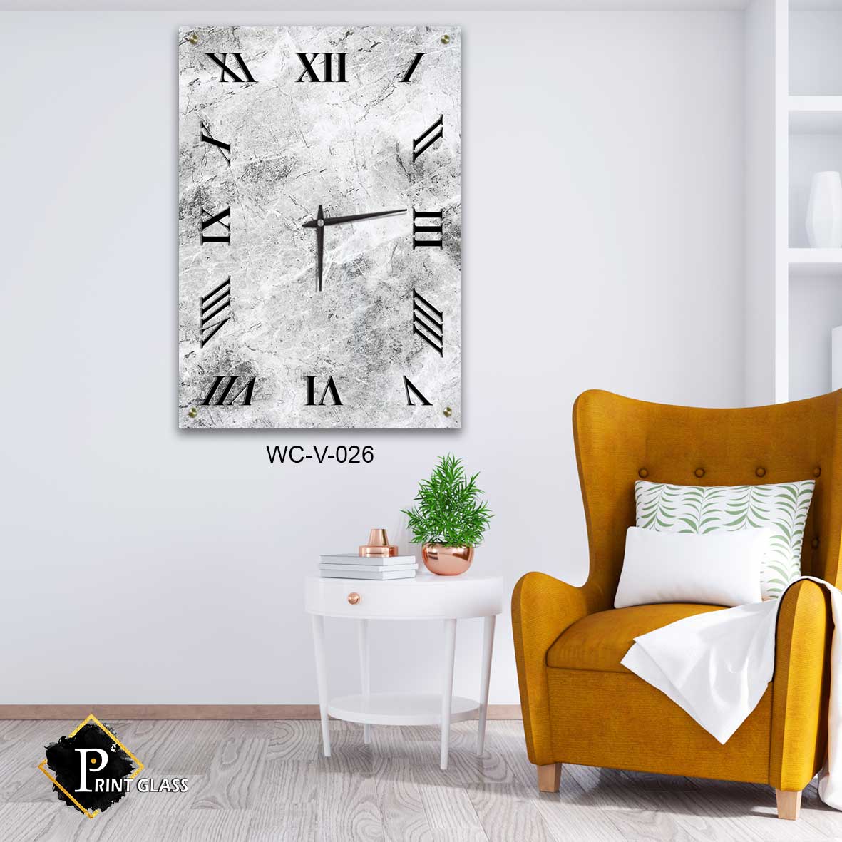 שעון קיר מעוצב לסלון מזכוכית של רקע שיש שחור אפור. מדגם – WC-V-026. שעון זכוכית מלבני לקיר בסלון ברקע שיש שחור אפור ומספריים רומיים. מגיע עם מחוגים שקטים גדולים ואיכותיים. מתאים לעיצוב הסלון או המשרד. מתאים גם לעיצוב העסק בצורה יוקרתית וייחודית , זכוכית מחוסמת 6מ"מ הדפסה על זכוכית בטכנולוגיה UV חדשנית.