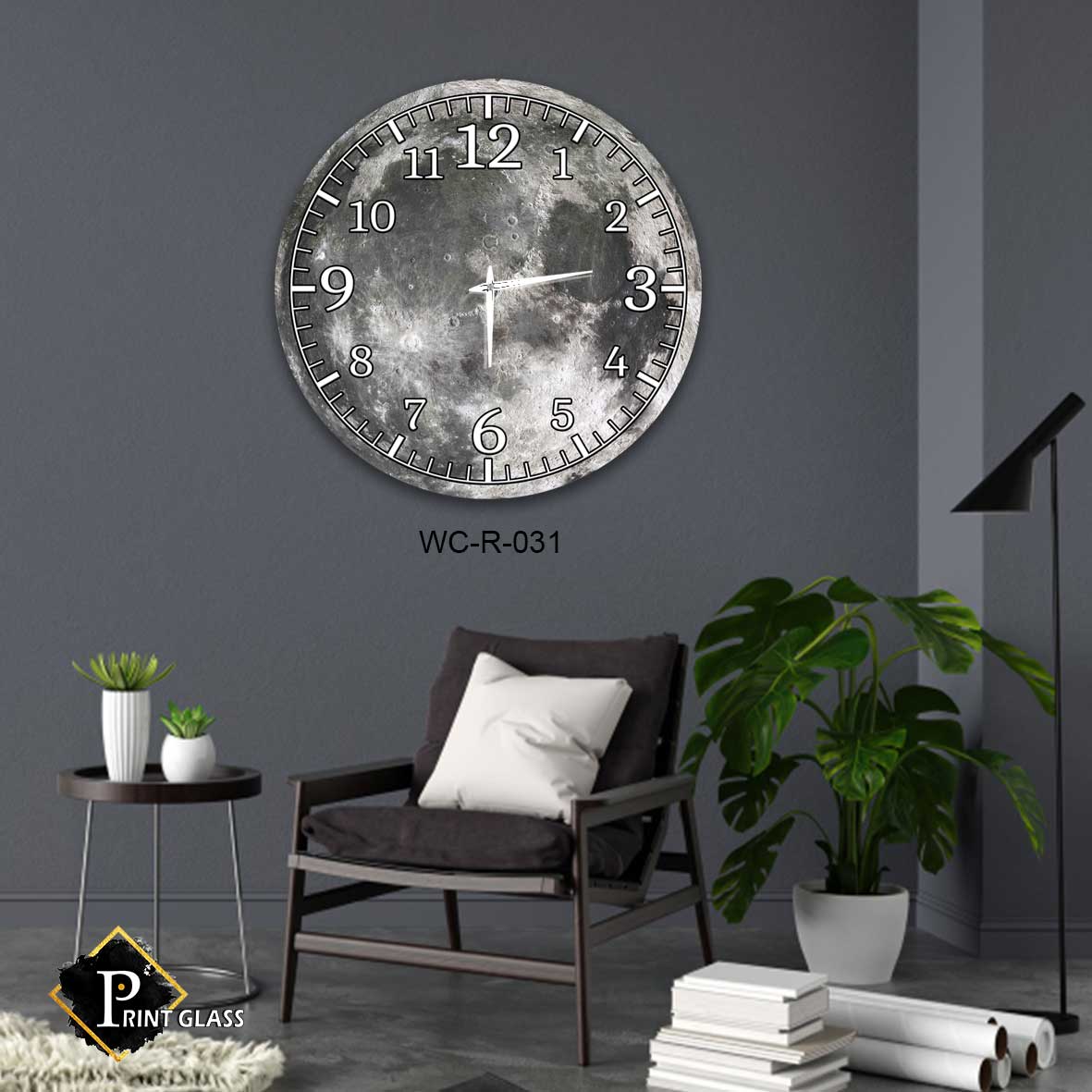 שעון קיר מיוחד לבית לבית מזכוכית ברקע ירח. מדגם – WC-R-031. שעון זכוכית עגול לקיר בבית ברקע של הירח. מגיע עם מחוגים שקטים גדולים ואיכותיים. מתאים לעיצוב הסלון או המשרד. מתאים גם לעיצוב העסק בצורה יוקרתית וייחודית , זכוכית מחוסמת 6מ"מ הדפסה על זכוכית בטכנולוגיה UV חדשנית.