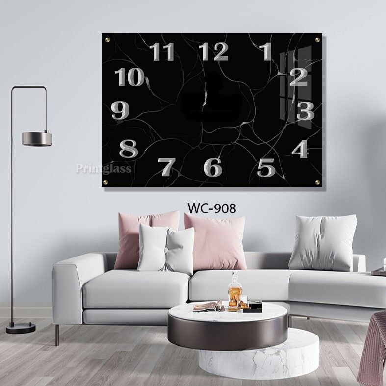 שעון זכוכית לחדר שינה ברקע שחור שיש. מדגם -WC-908. שעון קיר מלבני לחדר שינה ברקע שחור שיש ומספריים רומיים בצבע כסף. מגיע עם מחוגים גדולים. כולל מנגנון איכותי.