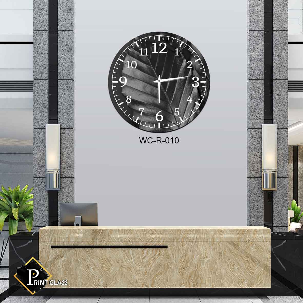 שעון קיר שחור לפינת אוכל גדול מזכוכית ברקע עלה לבן. מדגם – WC-R-010. שעון זכוכית עגול לקיר בפינת האוכל ברקע שחור וציור של עלה לבן. שעון זכוכית גדול ברקע שחור ועלה עם מספרים בצבע לבן. מגיע עם מחוגים שקטים גדולים ואיכותיים. מתאים לעיצוב הסלון או המשרד. מתאים גם לעיצוב העסק בצורה יוקרתית וייחודית , זכוכית מחוסמת 6מ"מ הדפסה על זכוכית בטכנולוגיה UV חדשנית.