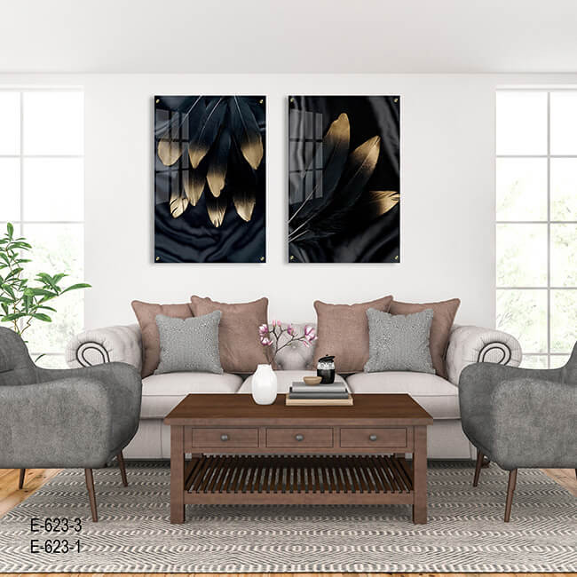 תמונות זכוכית לסלון בגוונים עשירים ומרהיבים של שחור וזהב, המשלבות קומפוזיציה זוגית של נוצות שחורות וזהובות על רקע שחור עמוק. הדפסה על זכוכית יוצרת מראה משפיע ואלגנטי שמעניק עומק וברק לתמונה, ומדגישה את הפרטים הדקים והאומנותיים של הנוצות המפורטים. תמונת זכוכית זו משדרת תחושת עדינות ויוקרה יחד עם נוכחות חזקה, ומוסיפה מראה עכשווי ומסוגנן לכל חלל. תמונות זכוכית אלו הן הבחירה המושלמת להענקת אופי וייחודיות לסלון, תוך דגש על איכות וצבעוניות מיוחדת המודגשת היטב באמצעות ההדפסה המתקדמת.
