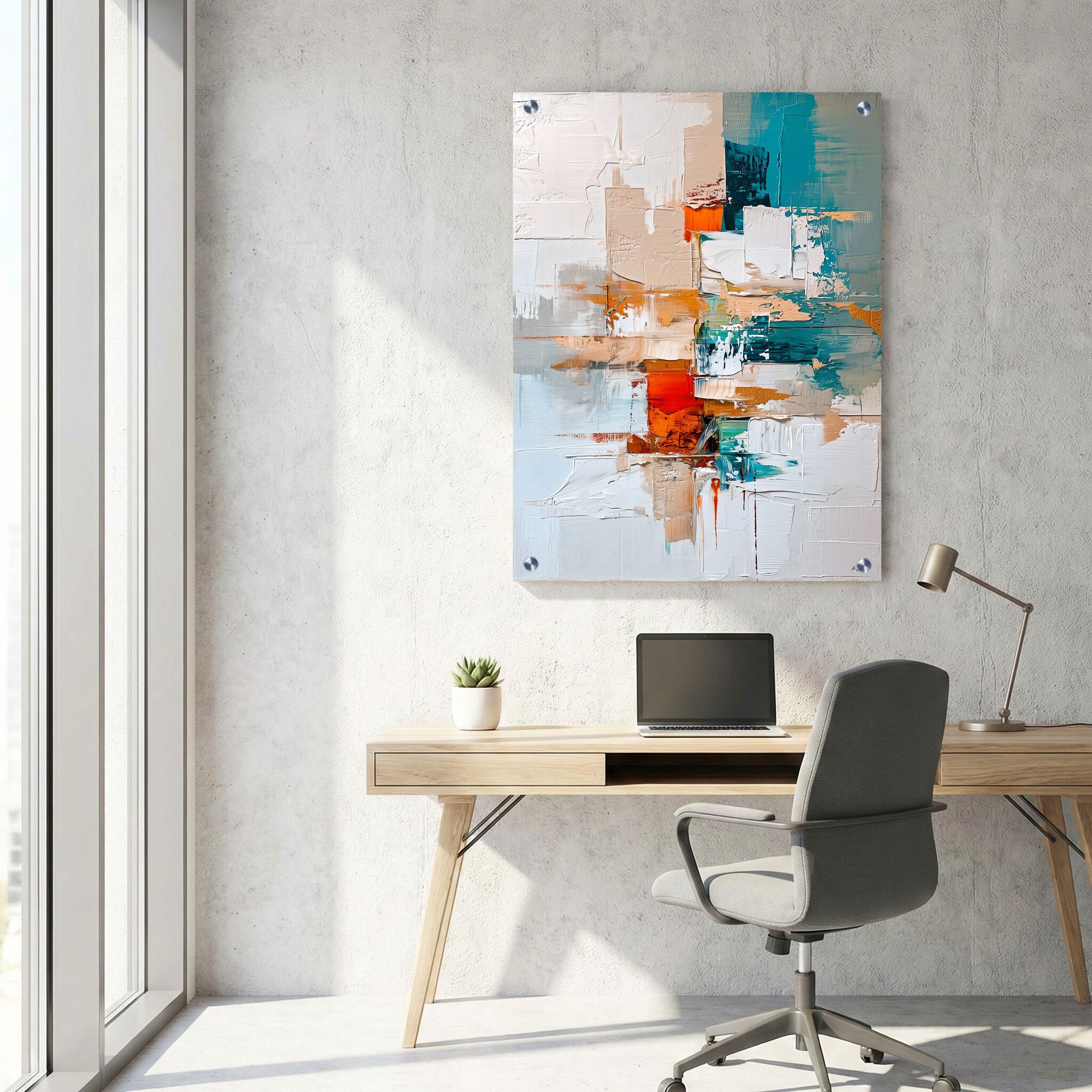 תמונה על זכוכית זו מציגה ציור אבסטרקטי עם מרקם עבה ומרשים המשלב צבעי טורקיז, כתום ואדום באופן המשתלב בהרמוניה צורנית וכולל קומפוזיציה מלבנית לאורך. ההדפסה על זכוכית מדגישה את עומק המרקם והצבעוניות החיה, ויוצרת אווירה דינמית ויצירתית. תמונות זכוכית למשרד מסוג זה מוסיפות נופך מודרני ואמנותי לחלל העבודה, כאשר תמונת זכוכית זו מתאימה במיוחד לסגנונות אבסטרקטיים ומביאה נגיעה מיוחדת של יצירתיות ותחכום. הדפסה על זכוכית איכותית מדגישה את הציור האבסטרקטי, ויוצרת תחושת עומק וחיים בתמונה, שהופכת את התמונות הזכוכית למשרד לפריט עיצובי מובלט ושובה לב.