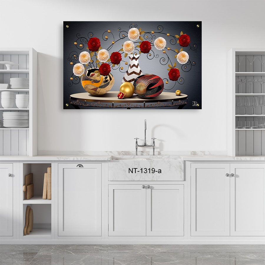 תמונת זכוכית למטבח – NT-1319-a. היא יצירה מרשימה שמשלבת בין יופי טבעי לבין אלגנטיות מודרנית. במרכז התמונה נראים אגרטלים מעוצבים עם דוגמאות ייחודיות שמחזיקים פרחי ורדים אדומים ולבנים. לצידם כדורים דקורטיביים בגווני זהב ואדום שמוסיפים ברק ואווירה חמה. השילוב של צבעי אדום ולבן עם אלמנטים מודרניים הופך את התמונה לבחירה מושלמת לכל מטבח שמעוניין בנגיעה יוקרתית.