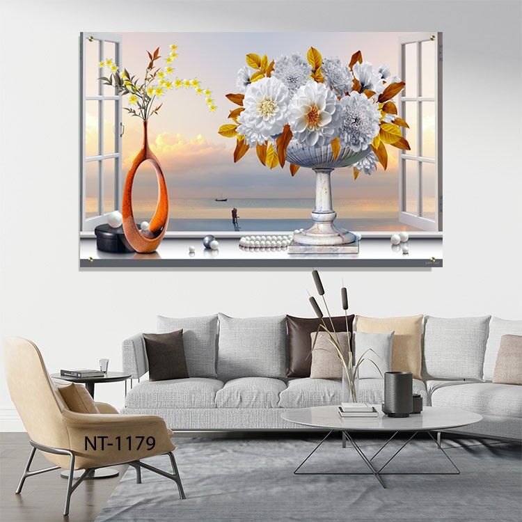 במרכז היצירה נראית קומפוזיציה מרשימה של שני אגרטלים. האחד כלי עגול גבוה בגוון חום־נחושת עם פרחים צהובים עדינים, והשני גביע שיש לבן מרשים ובו זר עשיר של פרחים לבנים גדולים עם עלים בגווני זהב־כתום. יחד הם יוצרים מראה חגיגי מלא חיים. הרקע מציג חלון פתוח לנוף ים עוצר נשימה עם שקיעה רכה, שמכניסה לחלל תחושת שלווה ורומנטיקה.