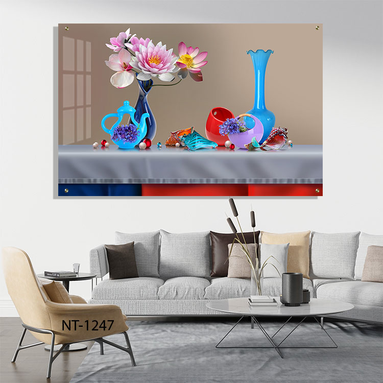 תמונת זכוכית לפינת אוכל – NT-1247. מציג סידור פרחים מלא חיים עם פרחי לוטוס ורודים־לבנים באגרטל כחול. ולצידם אגרטלים וכלי נוי בגווני כחול, סגול ואדום. זו תמונה מזכוכית שמכניסה לשולחן האוכל צבע. רעננות וניקיון עיצובי, ומתאימה במיוחד כפריט מרכזי בפינת האירוח המשפחתית.