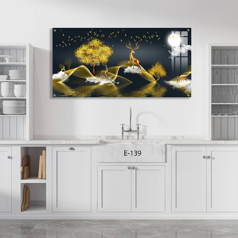 תמונה על זכוכית מרהיבה המציגה איילים עדינים בין עצים זהובים, עם ירח זורח המשתקף בבהירות במים מתחת. הדפסה על זכוכית זו יוצרת אווירה קסומה, בה אפשר להתרשם מהקומפוזיציה הפנורמית לרוחב המשלבת צבעים חמים של זהב וירוק עם כחול כהה של המים. תמונת זכוכית זו מעשירה את עיצוב המטבח בחדות וברכות, ומאפשרת ליצור תחושה של טבע ושלווה פנימית באמצעות תמונות זכוכית למטבח אותנטיות וייחודיות.