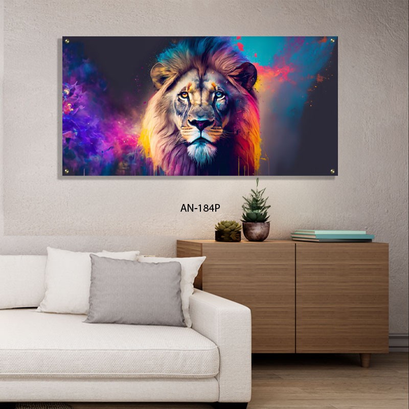העיצוב מציג אריה מלא עוצמה, דמות שמסמלת כוח, מנהיגות וביטחון עצמי. סביבו מתפרצים צבעים עזים של סגול, כחול, ורוד וכתום, שיוצרים קומפוזיציה דרמטית ומלאת חיים. זוהי לא רק עוד תמונה, אלא אחת מאותן תמונות של חיות שמעוררות השראה ומצליחות להפוך קיר רגיל למוקד תשומת לב.