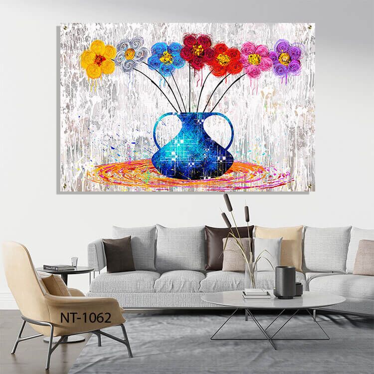 תמונת זכוכית לסלון פרחים צבעוניים. דגם NT-106. היא יצירה מרהיבה שמביאה לחלל מראה צעיר. מודרני ומלא שמחת חיים. ההדפסה מתבצעת על זכוכית מחוסמת אקסטרה־קליר בעובי של 6 מ״מ. איכות פרימיום שמבטיחה חדות צבעים גבוהה, ברק יוקרתי ועמידות לאורך שנים.