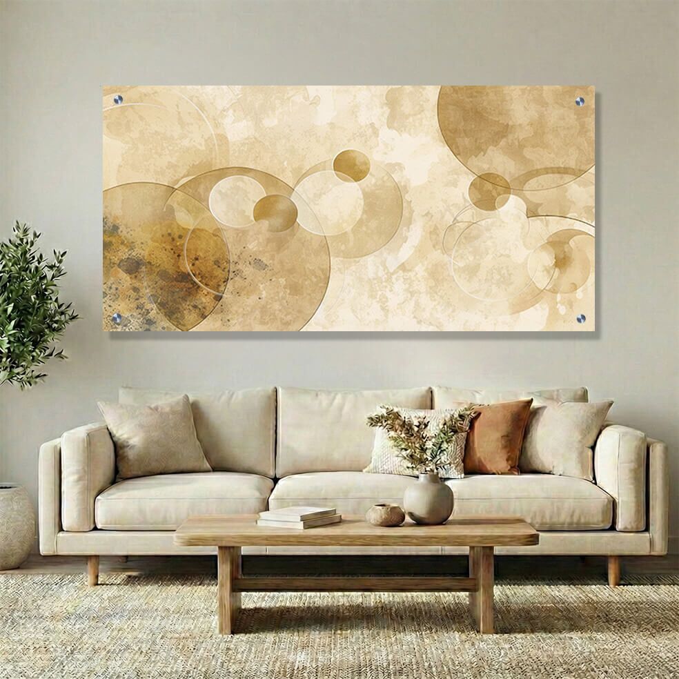 הדפסה על זכוכית איכותית המשלבת קומפוזיציה אבסטרקטית של עיגולים חופפים בגוונים זהב ובז' המעלים תחושה של עומק וחמימות. הרקע השמנת המחוספס מדגיש את הצבעים באלגנטיות ויוצר יצירת אומנות עדינה ומודרנית, המתאימה לתמונות זכוכית לסלון המעוניין להוסיף נגיעה של סגנון וייחודיות. תמונה על זכוכית זו מביאה לידי ביטוי חיבור מושלם בין גאומטריה לאמנות אבסטרקטית, שהופכת כל קיר למוקד תשומת לב. תמונת זכוכית איכותית זו מעניקה אווירה רכה ואסתטית גם באמצעות משחק הצבעים זהב ובז' על רקע שמנת מחוספס, ומתאימה לכל סגנון עיצובי.