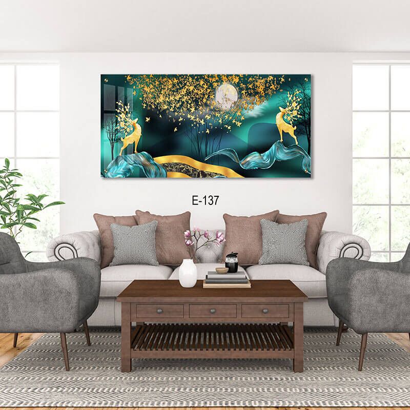 הדפסה על זכוכית זו מציגה תמונת זכוכית מרהיבה המתארת איילים זהובים, ירח ועלים זהובים על רקע כחול ירוק, בסגנון פנורמי לרוחב. הקומפוזיציה המדויקת משדרת אווירה טבעית ואלגנטית שמושלמת כתמונות זכוכית לסלון, תוך שילוב הרמוני של צבעים חמים וקרים שמדגישים את יופיים של האיילים והירח. תמונה על זכוכית זו מוסיפה מראה ייחודי ויוקרתי לכל פנים, ונותנת נופך אמנותי וטבעי לחלל הבית. תמונות זכוכית אלו מיועדות להעניק תחושה של עומק ותעוזה וניתנות להתקנה בקלות, כך שכל סלון יהפוך למרשים ונעים יותר לראות ולהרגיש.