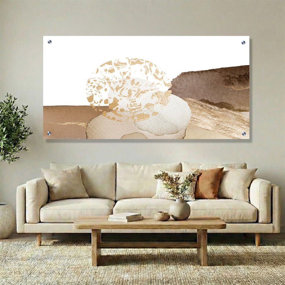 תמונת זכוכית זו מציגה קומפוזיציה אבסטרקטית מינימליסטית הכוללת עיגול זהב מנומר במרכז, בשילוב עם צורות אקוורל עדינות בצבעי בז' וחום, המעטרות רקע לבן נקי. ההדפסה על זכוכית משדרת אווירה מודרנית ואלגנטית, ויוצרת חיבור מושלם בין אמנות למינימליזם. תמונות זכוכית לסלון מתאפיינות בהרמוניה של צבעים וטקסטורות, תוך שמירה על איזון ותחושת שלווה. תמונת זכוכית זו אידיאלית למי המחפש עיצוב עדין ומעודן, עם נגיעות של צבע זהב שמוסיף נופך יוקרתי. תמונות זכוכית אלו מהוות בחירה נהדרת להצבת דגש על קירות פנורמיים בצורה אסתטית וחדשנית.