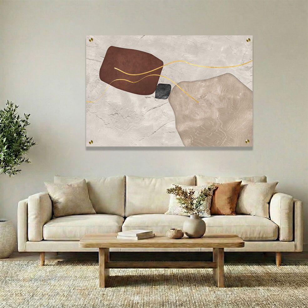 תמונה על זכוכית המשלבת קומפוזיציה אבסטרקטית מינימליסטית עם צורות אורגניות בגווני טרקוטה ובז' המשולבים על רקע טקסטורה שמנת עם קווי זהב עדינים. ההדפסה על זכוכית מביאה לידי ביטוי צבעים חמים ומרקמים עשירים, היוצרים מראה אלגנטי ועדכני. תמונות זכוכית לסלון בסגנון זה מוסיפות עומק ותחכום למרחב ומשדרגות את העיצוב הכללי. תמונת הזכוכית מלבנית לרוחב מבטיחה פריסה אסתטית ומאוזנת המשלבת אמנות מודרנית עם נגיעה טבעית, ומאפשרת יצירת אווירה נעימה ומזמינה בכל סלון.