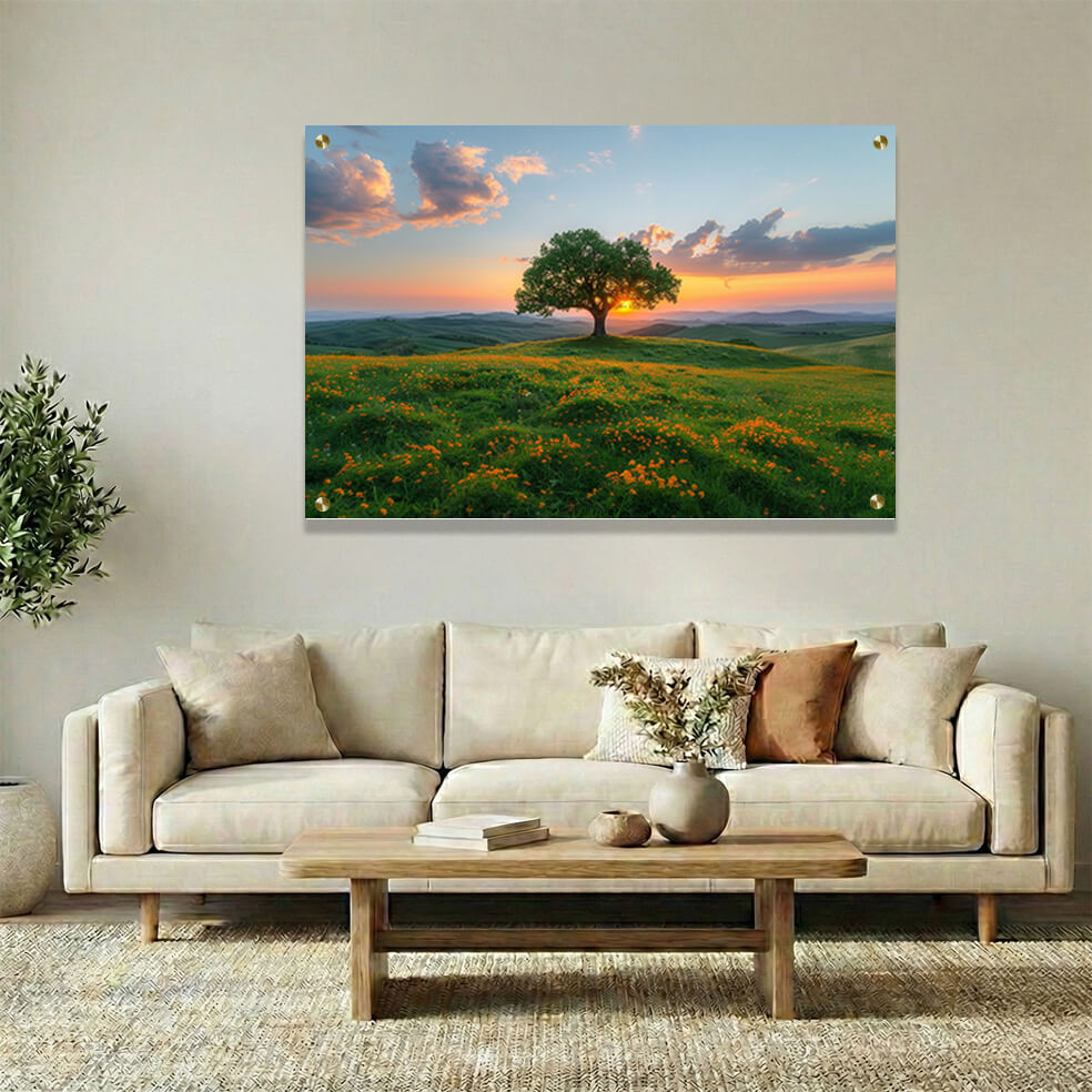 הדפסה על זכוכית מרהיבה המציגה עץ בודד ניצב על גבעה המכוסה בפרחים כתומים חיים, ראשוני בשקיעה זהובה חמה שמאירה את האופק וגבעות ירוקות שמוסיפות תחושת עומק והרמוניה. תמונת זכוכית זו שובה לב ומחממת כל חלל בה משתלבות תמונות זכוכית לסלון בעיצוב טבעי ופסטורלי. התמונה על זכוכית יוצרת אפקט ויזואלי מרהיב עם צבעים עשירים ומרגיעים, שבהם השימוש בצבעי השקיעה הכתומים-זהובים משתלב נפלא עם הרקע הירוק של הנוף. תמונות זכוכית אלו מהוות פתרון מושלם להענקת אווירה רכה וטבעית לכל חלל הבית.