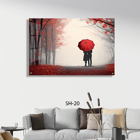 תמונת זכוכית מרהיבה הממחישה זוג עומדים תחת מטריה אדומה ביער, המצוירת בצבעי שחור לבן ואדום בולטים, המשלבים אווירה רומנטית מיוחדת. ההדפס המלבני לרוחב מציג קומפוזיציה מאוזנת ונעימה לעין, שבה צבע המטריה האדומה בולט כניגוד לקונטרסט העמוק של השחור ולבן של הסביבה. תמונות זכוכית לסלון מסוג זה מפתיעות ביכולתם להוסיף נגיעה של חום ורגש לחדר, והדפסה על זכוכית איכותית מדגישה את החדות והעומק של הצבעים. זוהי תמונה על זכוכית שמתאימה במיוחד לאוהבי אמנות עם דגש על רגעים אינטימיים בטבע, ויכולה לשמש כתמונת זכוכית מרכזית ומרשימה בסלון.