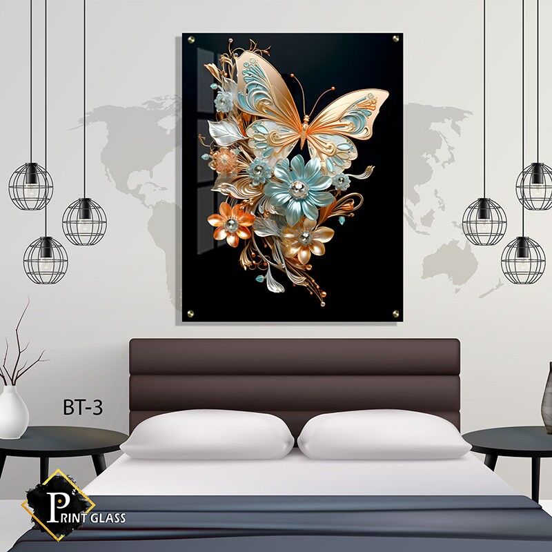 תמונה על זכוכית בפרופיל מלבני לאורך המשלבת יופי ופסטורליות עם פרפר זהב מובלט כחלק מרכזי ופרחים תלת ממדיים בגווני כחול וכתום שמוסיפים עומק ודינמיות ליצירה. תמונות זכוכית אלו יוצאות מן הכלל בהעברת תחושת עדינות ואלגנטיות, ומאפשרות להפוך כל קיר לחלק מחלום צבעוני ומרהיב. הדפסה על זכוכית יוצרת מראה חד וצלול שמדגיש כל פרט וחותם אומנותי. תמונת זכוכית זו מותאמת במיוחד לתמונות זכוכית לחדר שינה המבקשות לשלב אווירה של רוגע ויופי טבעי בעיצוב הפנים, ומוסיפה צבעוניות עם שילוב גוונים מדויק ומרהיב אשר מתאים למגוון דגמים וסגנונות.