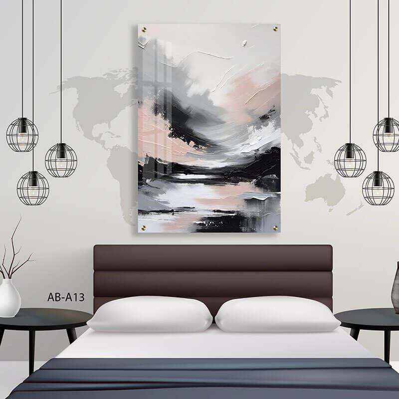 הדפסה על זכוכית שמציגה משיכות צבע מופשטות בגווני שחור, אפור וורוד, היוצרות קומפוזיציה מלבנית לאורך שמקנה תחושה עדינה ומודרנית. תמונות זכוכית לחדר שינה בעיצוב אבסטרקטי זה מציגות משחק צבעים עדין ומשיכות יד אומנותיות המעוררות רוגע והשראה. תמונה על זכוכית זו היא בחירה מושלמת למי שמחפש לשלב אלמנט אמנותי ואלגנטי בחדר השינה. תמונות זכוכית מדגישות את היופי והאיכות של הצבעים ומאפשרות לבלוט בקלות בכל חלל הודות לשילוב בין צורות מופשטות וצבעוניות עדינה.
