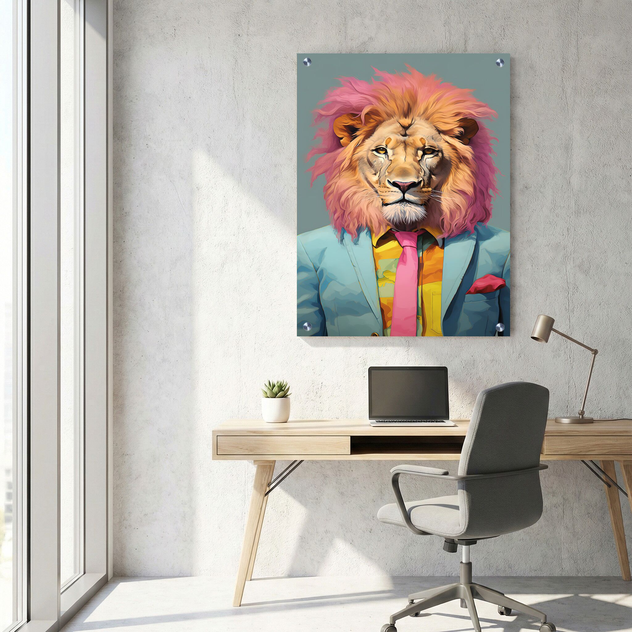 תמונת זכוכית זו מציגה אריה מרהיב בחליפה כחולה עם רעמה ורודה, המעוצבת בסגנון פופ ארט עכשווי על רקע תכלת. שילוב הצבעים החיוניים והעיצוב המלבני לאורך יוצרים קומפוזיציה מודרנית ומלאת חיים שמתאימה במיוחד לסביבת עבודה מקצועית. ההדפסה על זכוכית מדגישה את הפרטים והגוונים בצורה מדויקת, מה שהופך כל תמונת זכוכית למשרד לפריט אמנות יוצא דופן. זו תמונה על זכוכית שמוסיפה סטייל ואווירה ייחודית למשרד, ומתכתבת באופן טבעי עם מגוון של תמונות זכוכית למשרד בסגנונות עכשוויים ופופ ארט.