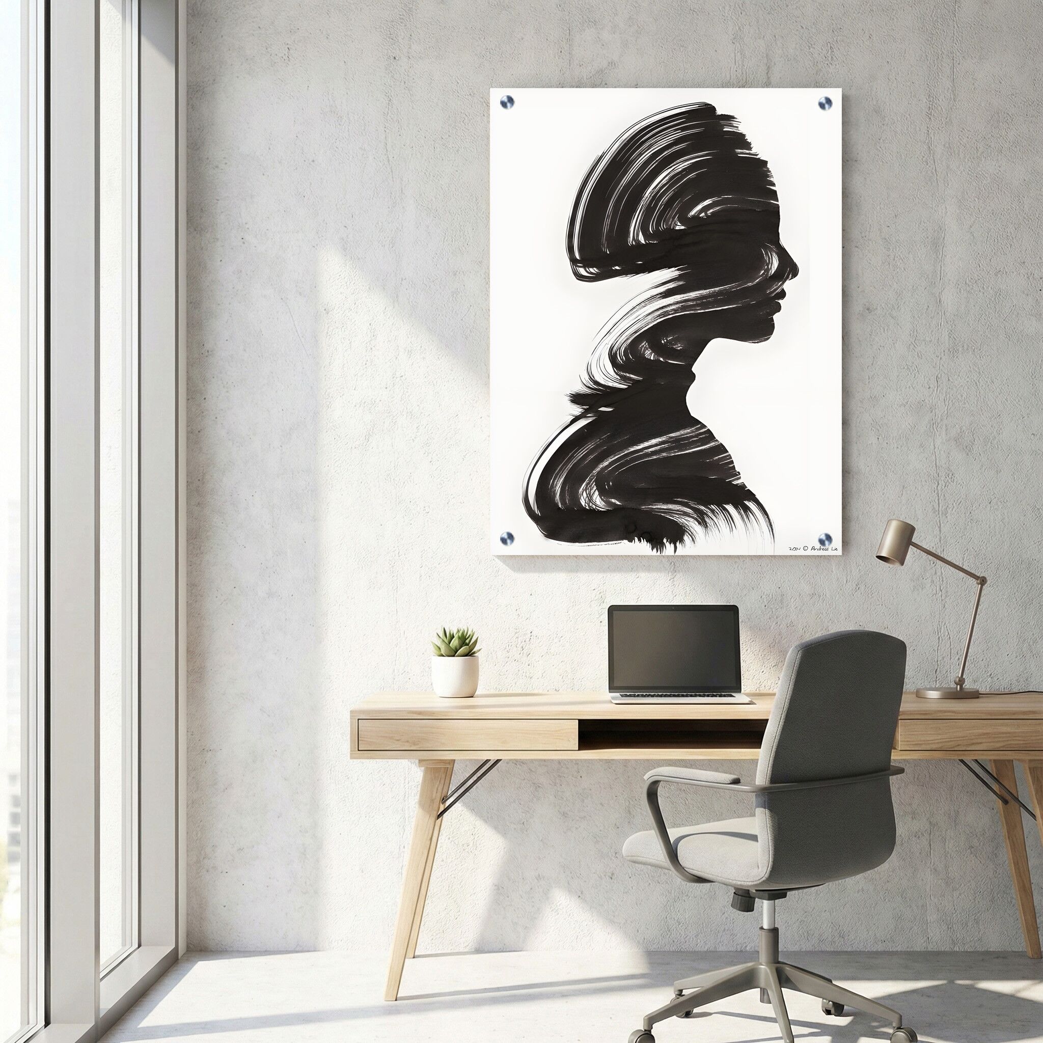 תמונת זכוכית למשרד המציגה פרופיל של אישה עם שיער שחור זורם, המעוצב בסגנון מברשת דיו על רקע לבן נקי. ההדפסה על זכוכית מדגישה את הקווים השזורמים והאסתטיקה המיוחדת של התמונה, היוצרת אווירה אמנותית ונעימה במרחב העבודה. תמונות זכוכית אלו מתאימות בדיוק למשרד, ומאפשרות לשדרג את עיצוב הקירות עם תמונה על זכוכית איכותית וחדשנית. תמונת זכוכית זו משלבת אלמנטים של אמנות מודרנית וקומפוזיציה מלבנית לאורך שממקסמת את ההשפעה החזותית, ומאפשרת ליצור נוכחות מוקפדת ומרעננת בחלל. בין היתר, תמונות זכוכית למשרד מסוג זה הן הבחירה המושלמת למי שמעוניין לשלב אמנות ופונקציונליות בעיצוב משרדו.