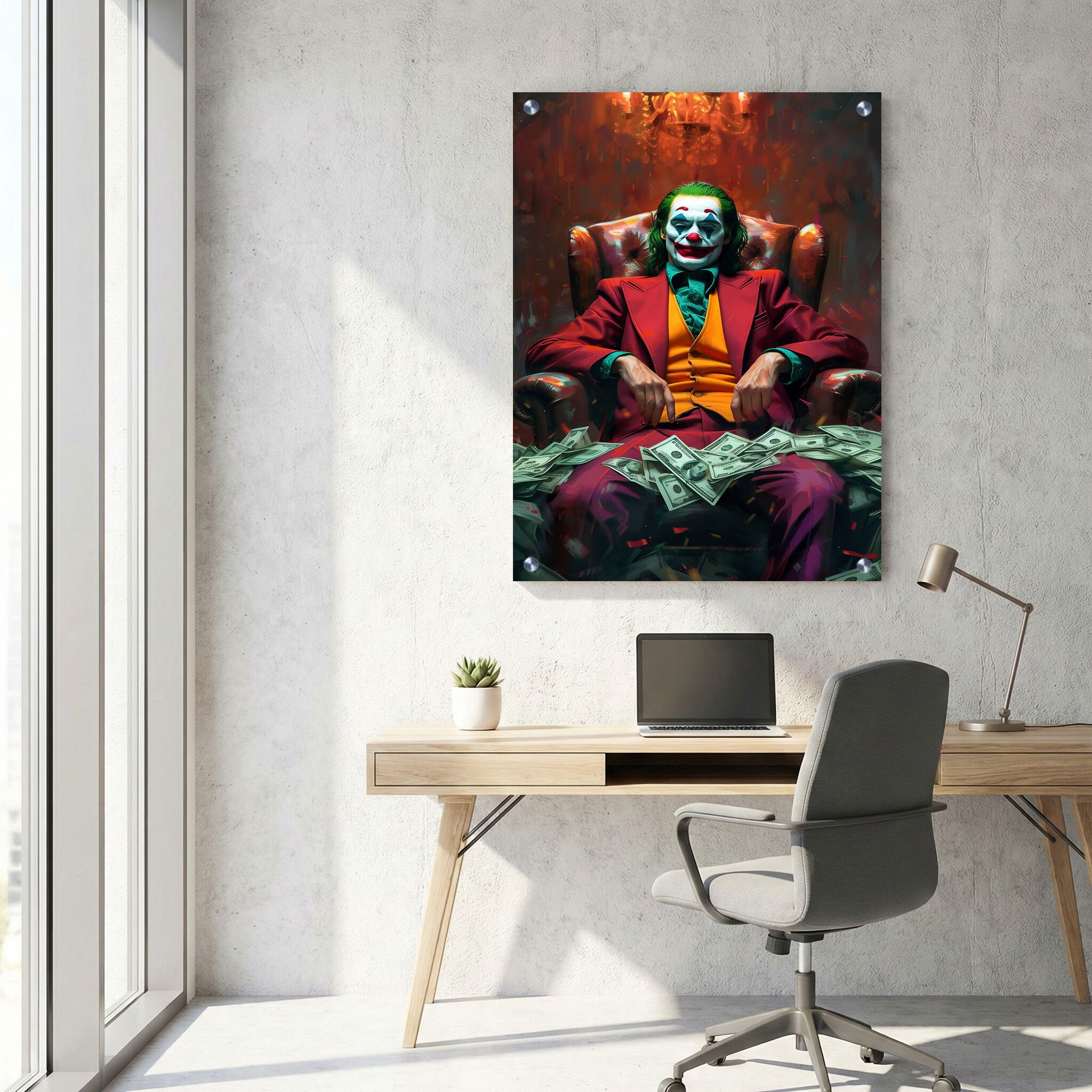 תמונת זכוכית מרהיבה המציגה את הג'וקר יושב בנינוחות על כיסא עור, מוקף בשטרות כסף הבולטים במיוחד על רקע אדמדם חמים ועוצמתי. ההרכבה המלבנית לאורך מדגישה את האווירה המסתורית והססגונית שבה הדמות שוכנת, בעוד ההדפסה על זכוכית מציגה את כל הפרטים בצורה חדה וברורה. תמונות זכוכית למשרד מסוג זה מוסיפות אלמנט עיצובי עוצמתי וייחודי למרחב העבודה, ויוצרות אווירה יוצאת דופן של סגנון ואופי. תמונה על זכוכית כמו זו היא פתרון אידאלי להדגשה של עיצוב מודרני עם טאצ' דרמטי, כשברקע השראה מסצנות פופ ארט מלאות ביטוי. בחירת ההדפסה על זכוכית מבטיחה עמידות ופונקציונליות לצד היופי והאסתטיקה.