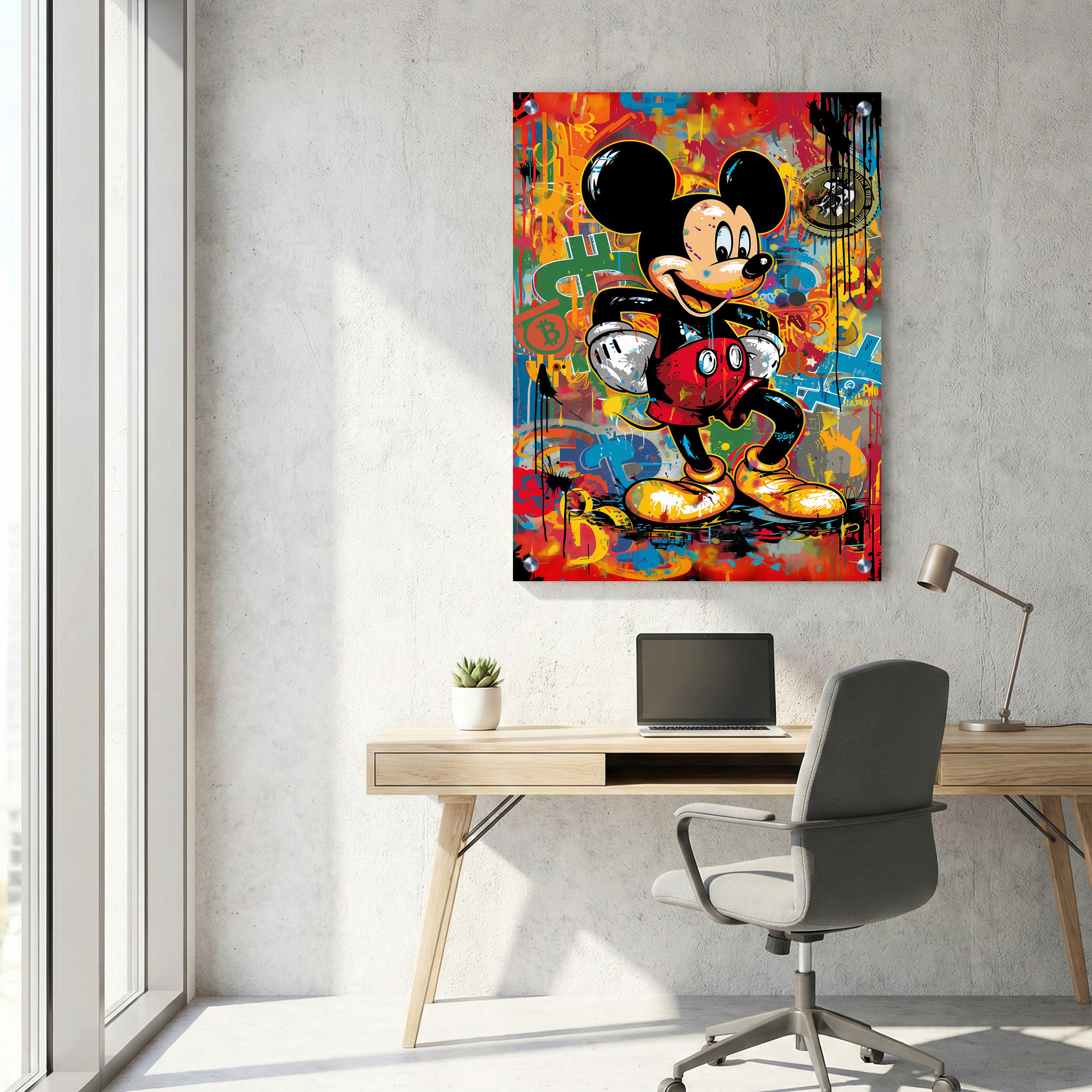 הדפסה על זכוכית ייחודית המציגה תמונת זכוכית צבעונית וגרפית של מיקי מאוס קלאסי. בתמונה מלבנית לאורך, הצבעים העזים והכתובות מעניקים אווירה צעירה ודינמית שמתאימה במיוחד כתמונות זכוכית למשרד. שילוב הסגנון הגרפיטי עם הדמות האיקונית של מיקי מאוס יוצר יצירה מלאת חיים שיכולה להוסיף נגיעה של יצירתיות למרחב העבודה. תמונה על זכוכית זו מהווה בחירה אידיאלית לקישוט מודרני ומרהיב שמשלב תרבות פופ עם אמנות עכשווית.