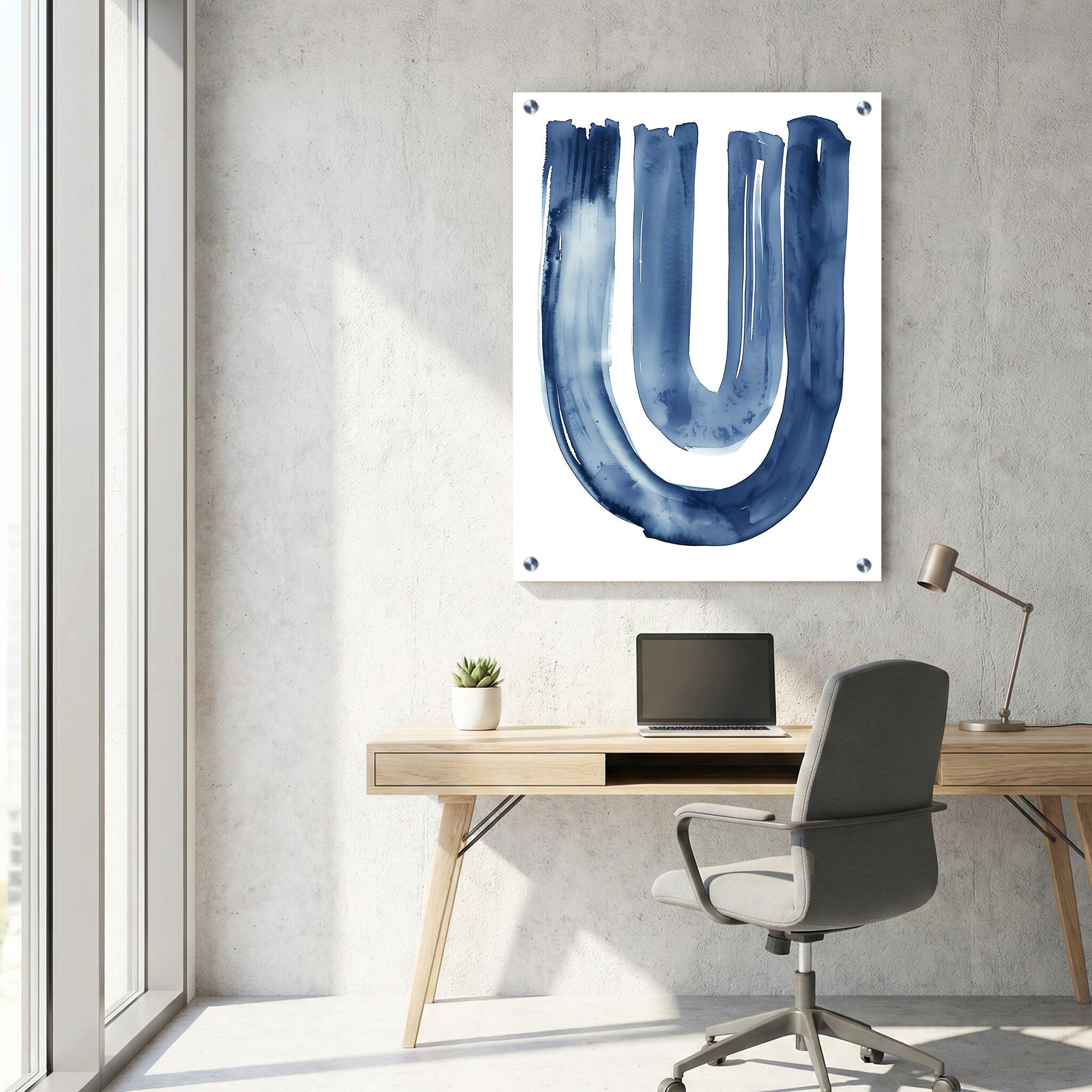 תמונה על זכוכית בעלת עיצוב מינימליסטי ומרגיע הכוללת צורת קשת כפולה בצבע כחול כהה, המונחת על רקע לבן מלבני לאורך. הדפסה על זכוכית זו משדרת ניקיון ודיוק עם קווי מתאר אלגנטיים, ומביאה איזון ותחושת שקט חזותית. תמונות זכוכית אלו למשרד מביאות עניין וייחודיות עם השימוש המעודן בגווני כחול כהה בהדפס, המתאימות באופן מושלם ליצירת אווירה מקצועית וחדשנית. תמונת זכוכית זו משלבת יצירתיות וסטייל גאומטרי עדין, המתאימה כחלק מעיצוב מודרני ורגוע של חללים משרדיים באמצעות תמונות זכוכית איכותיות ומוקפדות.