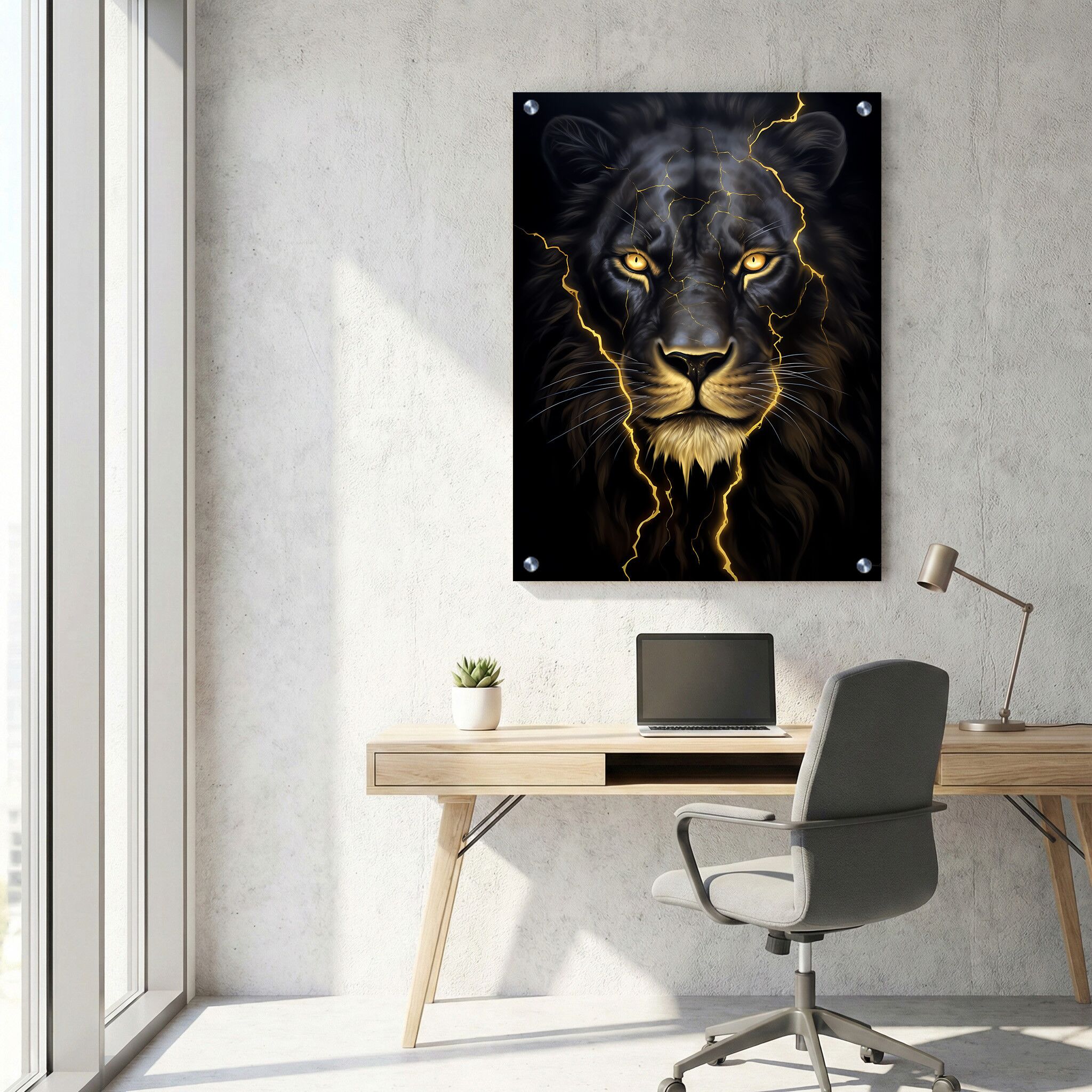 תמונת זכוכית במבנה מלבני לאורך המתארת ראש אריה שחור מרהיב עם עיניים זוהרות המקנות תחושת עוצמה ועניין לצד סדקי זהב עדינים שמוסיפים נגיעות אלגנטיות וזוהרות על רקע שחור חזק. ההדפסה על הזכוכית מדגישה את פרטי הפנים של האריה בצורה חדה ובולטת, מה שיוצר תמונה על זכוכית דרמטית ואומנותית שמתאימה במיוחד לתמונות זכוכית למשרד המעניקות נוכחות חזקה וסגנון מודרני. תמונת זכוכית זו משלבת בין עומק צבעים חזק לאלמנטים אור נוגעים, ויוצרת יצירת אמנות מעוררת השראה ויוקרתית.