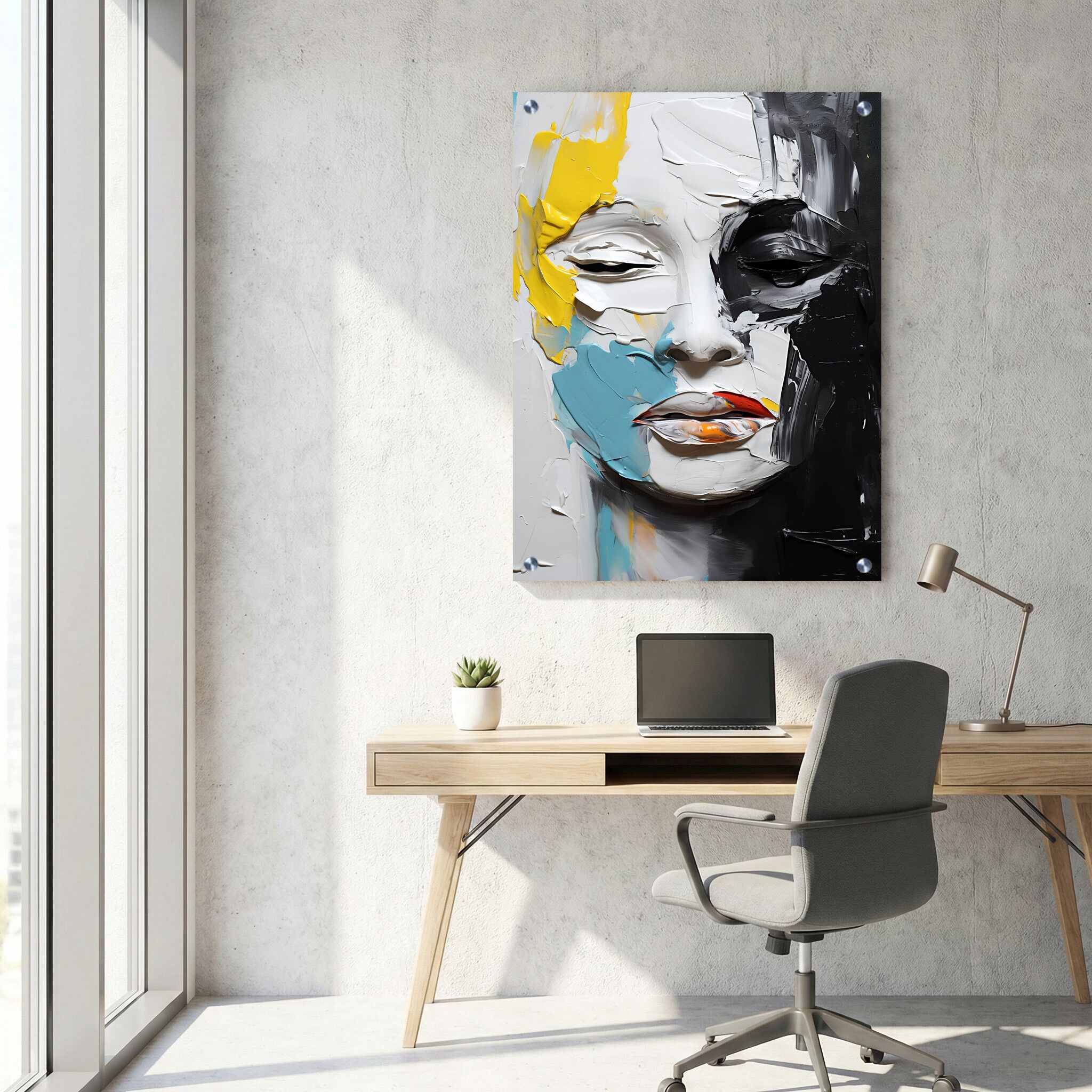 תמונת זכוכית זו מציגה פורטרט מופשט של פנים אישה, בשחור ולבן עם אקצנטים צבעוניים המדגישים את היופי המיוחד של הקומפוזיציה. ההדפסה על זכוכית מדגישה את הניגודיות והסגנון המודרני של העיצוב, שיוצר אווירה ייחודית ורעננה. מדובר בתמונה על זכוכית מלבנית לאורך, המתאימה כתמונות זכוכית למשרד, ומעניקה אלגנטיות ותחכום לחלל בעזרת שילוב נקי של שחור, לבן ונגיעות צבע. תמונת זכוכית זו מהווה בחירה מצוינת להתחדשות ועיצוב אלגנטי עם מראה אמנותי אבסטרקטי ועכשווי.