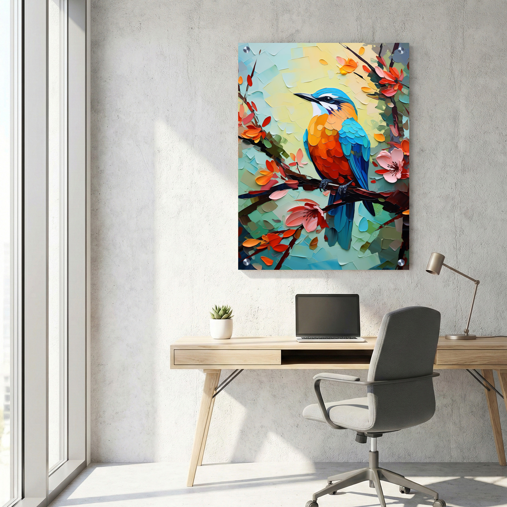 הדפסה על זכוכית זו מציגה תמונה צבעונית ומרהיבה של ציפור קינגפישר יפיפייה היושבת על ענף מוקף בפרחים ורודים. התמונה על זכוכית זו משלבת פרטים עדינים וצבעוניות עשירה, היוצרים מראה מלא חיים וייחודי. תמונת זכוכית זו מתאימה במיוחד כתמונה למשרד, ומדגישה את היופי שבטבע באמצעות צבעים רעננים וקומפוזיציה מלבנית לאורך. תמונות זכוכית למשרד מסוג זה הופכות כל חלל למזמין ואלגנטי, עם אווירה נעימה שהטבע מביא עמו. אם אתם מחפשים לשדרג את משרדי העבודה שלכם, תמונת זכוכית עם ציפור קינגפישר וצבעוניות ורודה תוסיף מגע של השראה וייחודיות.