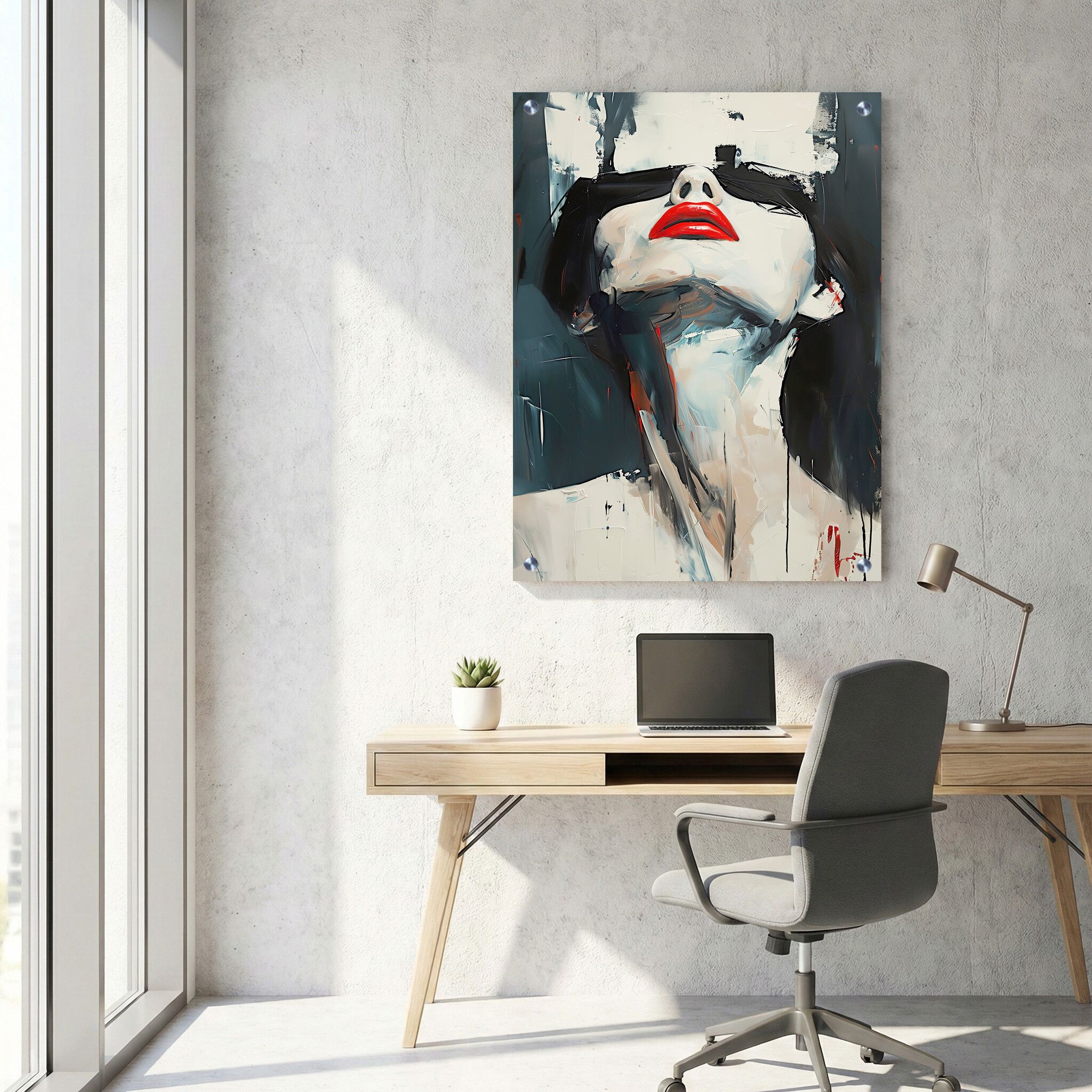תמונת זכוכית מרהיבה ומודרנית המתארת פורטרט של אישה עם שפתיים אדומות בולטות ועיניים מכוסות, בסגנון ציור מופשט המשלב קווים ומרקמים ייחודיים. הקומפוזיציה המלבנית לאורך מאפשרת שילוב איכותי ואפקטיבי כקישוט משרדי יצירתי ומעורר השראה. ההדפסה על זכוכית יוצרת מראה מבריק ושקוף, המשדר עוצמה ואלגנטיות, ומאפשרת יצירת אווירה מקצועית וחדשנית. תמונות זכוכית למשרד זו מאפשרת להעניק למרחב העבודה טאץ' של אמנות עכשווית וייחודית, וכל זאת באמצעות תמונה על זכוכית באיכות גבוהה ובגוון צבעים עשיר, המדגיש את הדינמיות בקווים המופשטים.