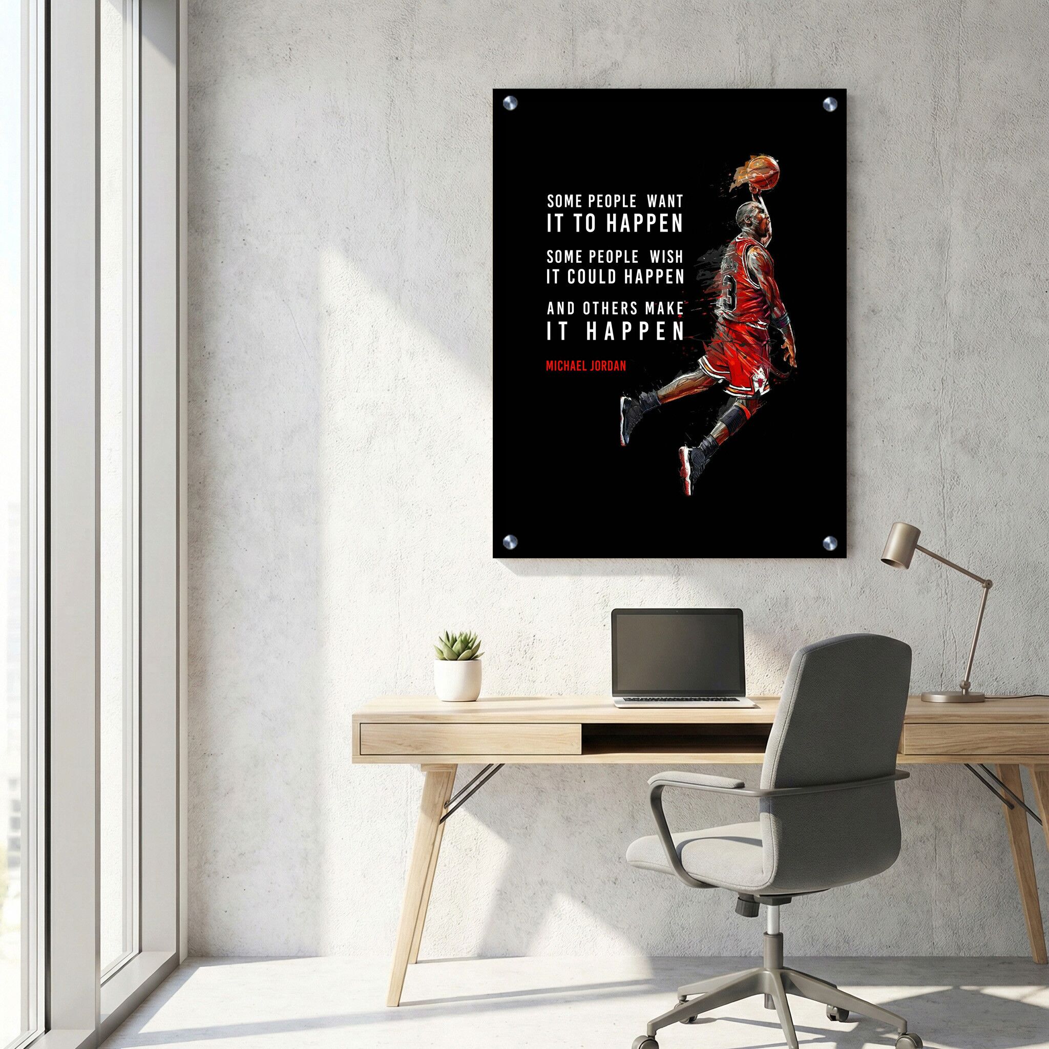 תמונת זכוכית מלבנית לאורך זו מציגה הדפסה על זכוכית איכותית של מייקל ג'ורדן הקופץ לסל, עם ציטוט מוטיבציה בולט על רקע שחור. האווירה שנוצרת היא של עוצמה, השראה ומיקוד, המתאימה במיוחד עבור סביבת עבודה ותמונות זכוכית למשרד. השילוב בין הדמויות הדינמיות והטקסט המניע יוצר קומפוזיציה מרשימה המבליטה את ייחודיותה של תמונת זכוכית זו, אידיאלית לחיזוק המוטיבציה והאנרגיה בחלל המשרד.
