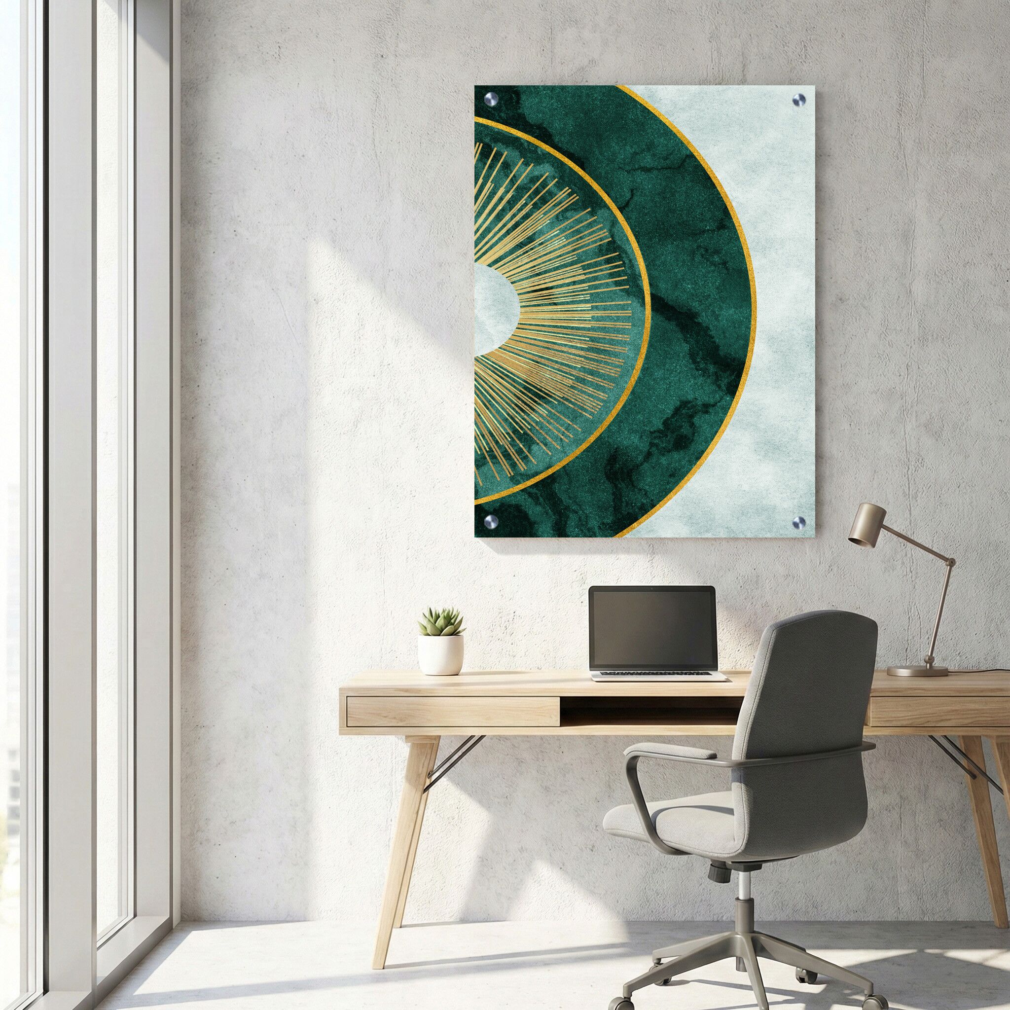 תמונת זכוכית למשרד עם עיצוב מינימליסטי שמרכז את העין על חצי עיגול ירוק. אלמנט מרכזי זה מעוטר בקרניים בצבע זהב שמוסיפות נופך יוקרתי ועדין. הרקע מורכב מצבעים ירוקים ולבנים, היוצרים יחד קומפוזיציה מאוזנת והרמונית. תמונת זכוכית זו משדרת אווירה מקצועית ועדכנית, מתאימה במיוחד להדפסה על זכוכית היוצרת תמונות זכוכית למשרד באיכות גבוהה. תמונה על זכוכית זו מביאה לידי ביטוי את היופי שבסגנון המינימליסטי באמצעות קומפוזיציה נקייה וצבעים מרגיעים, אידיאלית לעיצוב אלגנטי ונקי של חללים עסקיים. תמונות זכוכית מסוג זה משלבות אמנות וגאומטריה בצורה עדינה ומושכת.