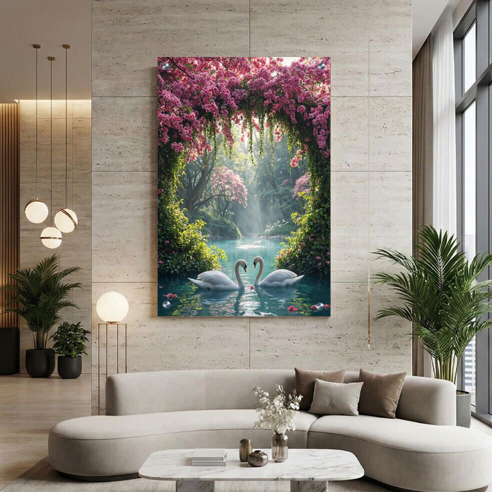 תמונת זכוכית זו מציגה נוף פנטזיה קסום שבו זוג ברבורים לבנים שוחים בנהר שקט מוקף בפרחים ורודים וכחולים. הצבעים העדינים והקומפוזיציה המלבנית לאורך יוצרים אווירה של רוגע ושלווה טבעית, המשלבת אלמנטים של טבע ויופי רגוע. הדפסה על זכוכית זו מעניקה לתמונה מראה מבריק ועמוק, שמוסיף נופך אלגנטי לכל חלל. בזכות האיכות הגבוהה של תמונות זכוכית לסלון, התמונת זכוכית הזו מהווה בחירה מושלמת לקישוט ייחודי ומהפנט. תמונה על זכוכית בולטת זו משלבת בין צבעוניות עשירה לפרטים עדינים, ומוסיפה מימד של אמנות לכל סביבה.